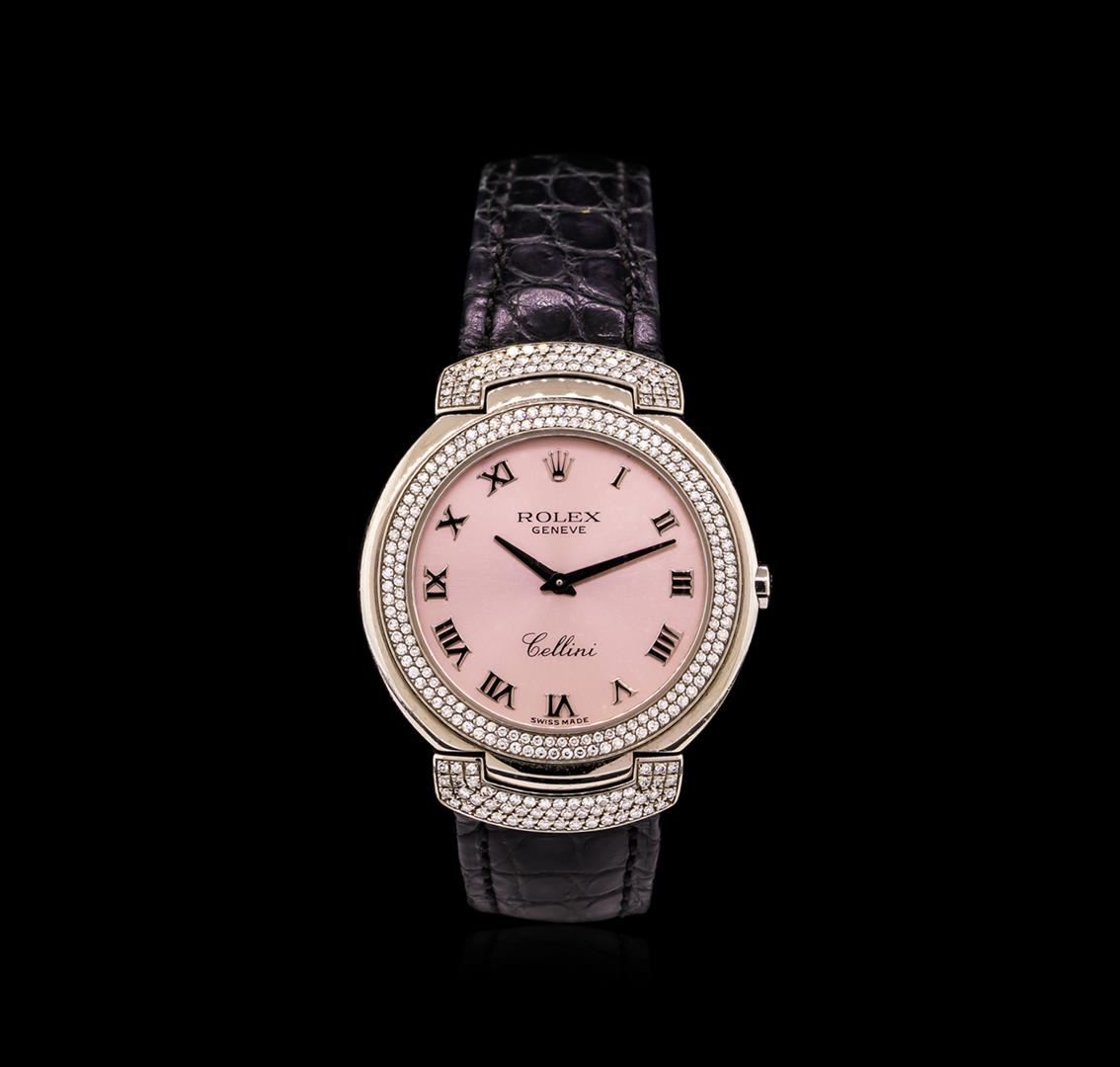 One, Rolex Cellini Cellissima wristwatch, electronically tested 18KT white gold, Case: 33mm diameter, Case Back: engraved with the manufacturers ID numbers, Bezel: diamond set, Logo'd Crown: Crystal: synthetic sapphire, Circa 1999.Movement: quartz, Dial: Pink, with pointed hands and Roman numerals, signed Rolex Cellini, Bracelet: Rolex, saddle stitched crocodile strap, 18KT white gold Buckle: Rolex concealed deployment clasp, Condition: G-5 fine. Seven and one half inch length, adjustable. Containing: Two Hundred Seventy Two single cut diamonds, approximate total weight equals 1.00ct. Set & graded in the bezel, and the case lugs. Clarity VS-1 Average. Color: F - G. Total Weight of Diamonds 1.00ct. Total Weight of Watch 58.40 grams. AIG Appraised at $19,750.00.