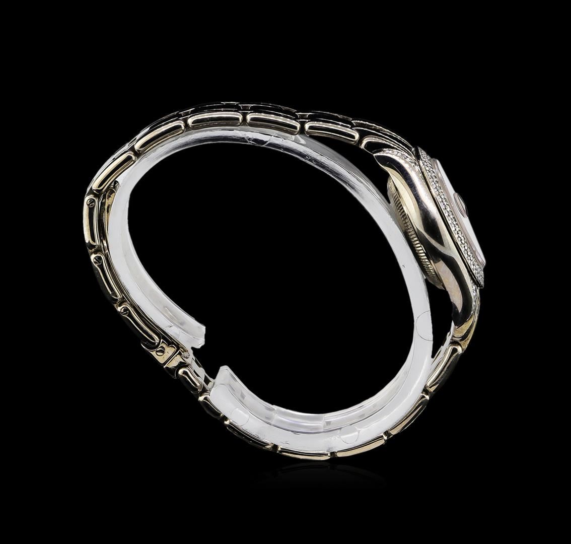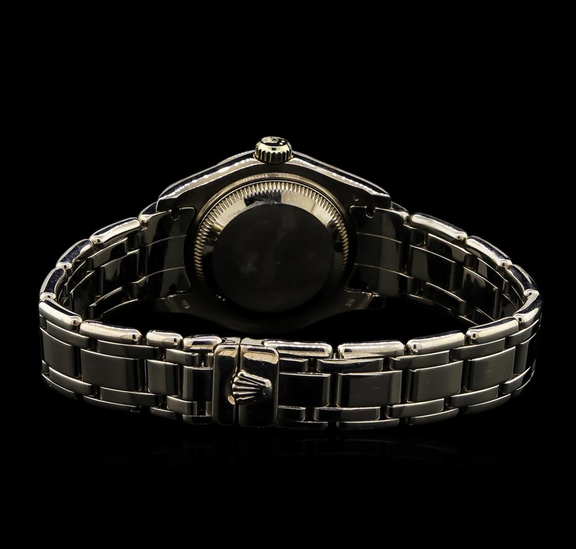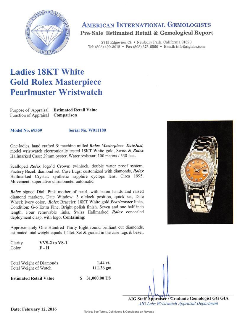 One ladies, hand crafted & machine milled Rolex Masterpiece DateJust, model wristwatch electronically tested 18KT White gold, Swiss & Rolex Hallmarked Case: 29mm oyster, Water resistant: 100 meters / 330 feet. Scalloped Rolex logo'd Crown: twinlock, double water proof system, Factory Bezel: diamond set, Case Lugs: customized with diamonds, Rolex Hallmarked Crystal: synthetic sapphire cyclops lens. Circa 1995. Movement: superlative chronometer automatic. Rolex signed Dial: Pink mother of pearl, with baton hands and raised diamond markers, Date Window: 3 o'clock position, quick set, Date Wheel: Ivory color, Rolex Bracelet: 18KT White gold Pearlmaster links, Condition: G-6 Extra Fine. Bright polish finish. Seven and one half inch length. Four removable links. Swiss Hallmarked Rolex concealed deployment clasp, with logo. Containing: Approximately One Hundred Thirty Eight round brilliant cut diamonds, estimated total weight equals 1.44ct. Set & graded in the case lugs & bezel. Clarity VVS-2 to VS-1. Color: F - H. Total Weight of Diamonds 1.44ct. Total Weight of Watch 111.26gm. AIG Appraised at $31,000.00.