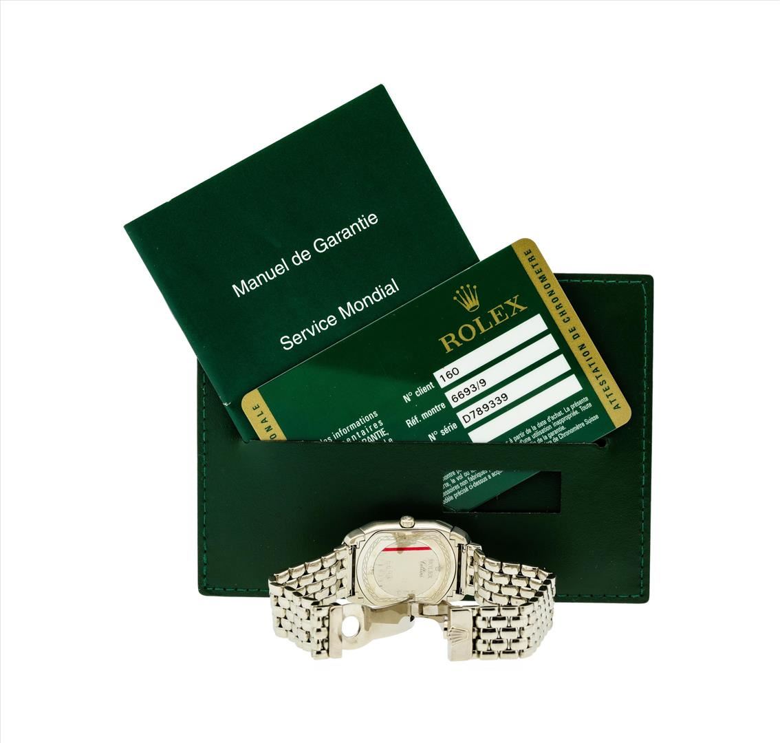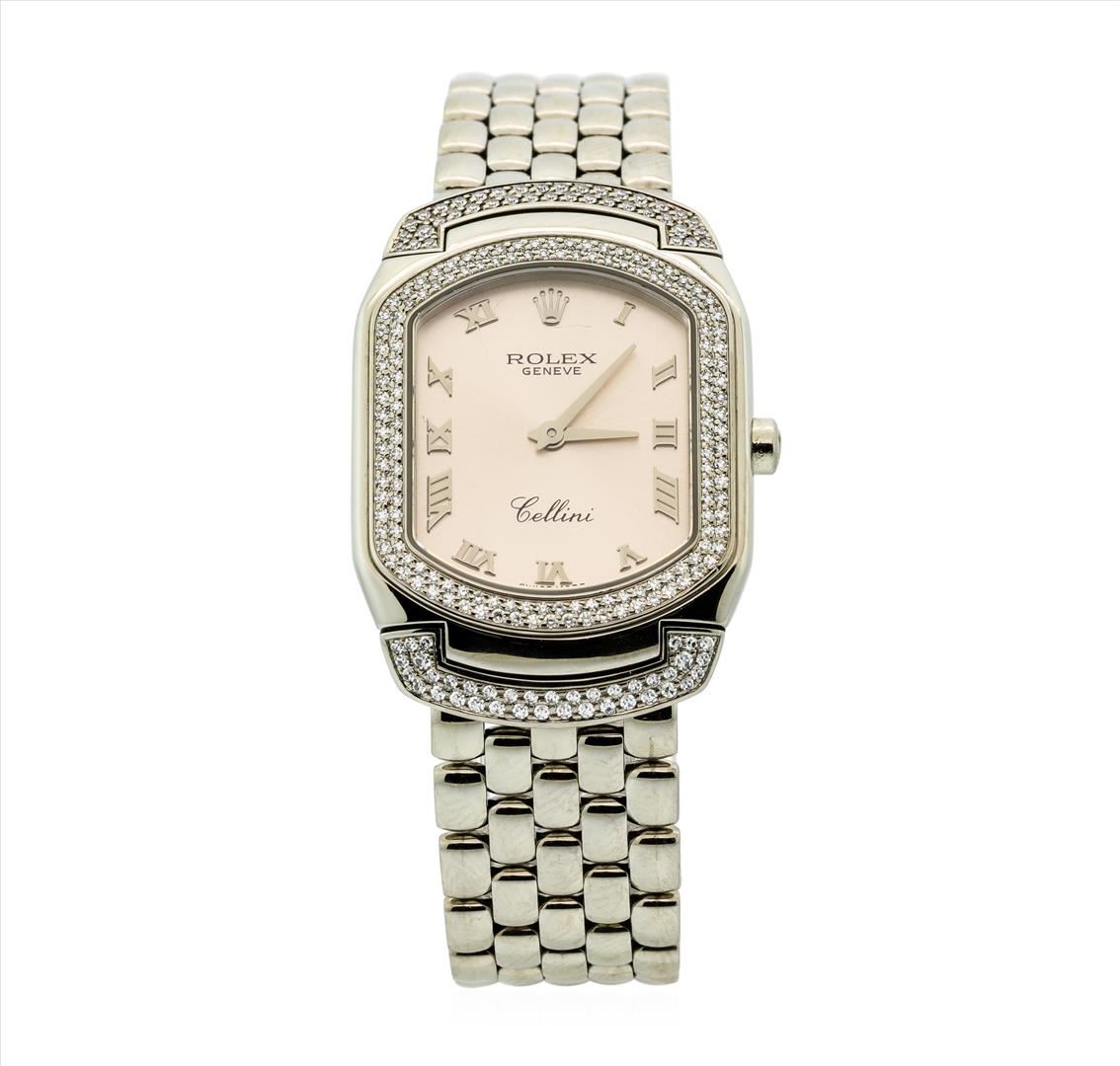 One ladies, Rolex Cellini Cellissma Model wristwatch electronically tested, 18KT White gold, Swiss and Rolex Hallmarked Case: 33mm x 25mm, Rolex Signature Crown: twinlock with high relief logo, Case Lugs: diamond set, Bezel: diamond set, Crystal: synthetic sapphire cyclops lens, Circa 2006. Swiss Movement: quartz, Rolex Cellini signed Dial: Pink color, pointed hands & raised Roman numerals, Condition: G-7 Near Mint, Rolex Cellini Bracelet: 18KT White gold links. Six inch length. Swiss & Rolex Hallmarked concealed clasp, with high relief logo. Containing: Two Hundred Twenty Two prong set single cut diamonds, measuring 1.20mm - 0.70mm in diameter, approximate total weight of 222 stones equals 0.65ct. Set & graded in the bezel. Clarity: VVS-1 to VS-1. Color: E - F. Total Weight of Diamonds 0.65ct. Total Weight of Watch 79.90gm. Comes with original papers. AIG Appraised.