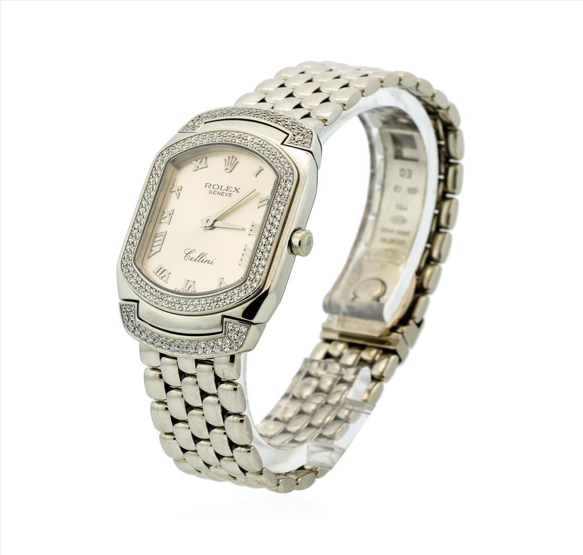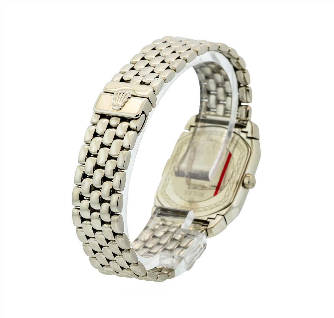 One ladies, Rolex Cellini Cellissma Model wristwatch electronically tested, 18KT White gold, Swiss and Rolex Hallmarked Case: 33mm x 25mm, Rolex Signature Crown: twinlock with high relief logo, Case Lugs: diamond set, Bezel: diamond set, Crystal: synthetic sapphire cyclops lens, Circa 2006. Swiss Movement: quartz, Rolex Cellini signed Dial: Pink color, pointed hands & raised Roman numerals, Condition: G-7 Near Mint, Rolex Cellini Bracelet: 18KT White gold links. Six inch length. Swiss & Rolex Hallmarked concealed clasp, with high relief logo. Containing: Two Hundred Twenty Two prong set single cut diamonds, measuring 1.20mm - 0.70mm in diameter, approximate total weight of 222 stones equals 0.65ct. Set & graded in the bezel. Clarity: VVS-1 to VS-1. Color: E - F. Total Weight of Diamonds 0.65ct. Total Weight of Watch 79.90gm. Comes with original papers. AIG Appraised.