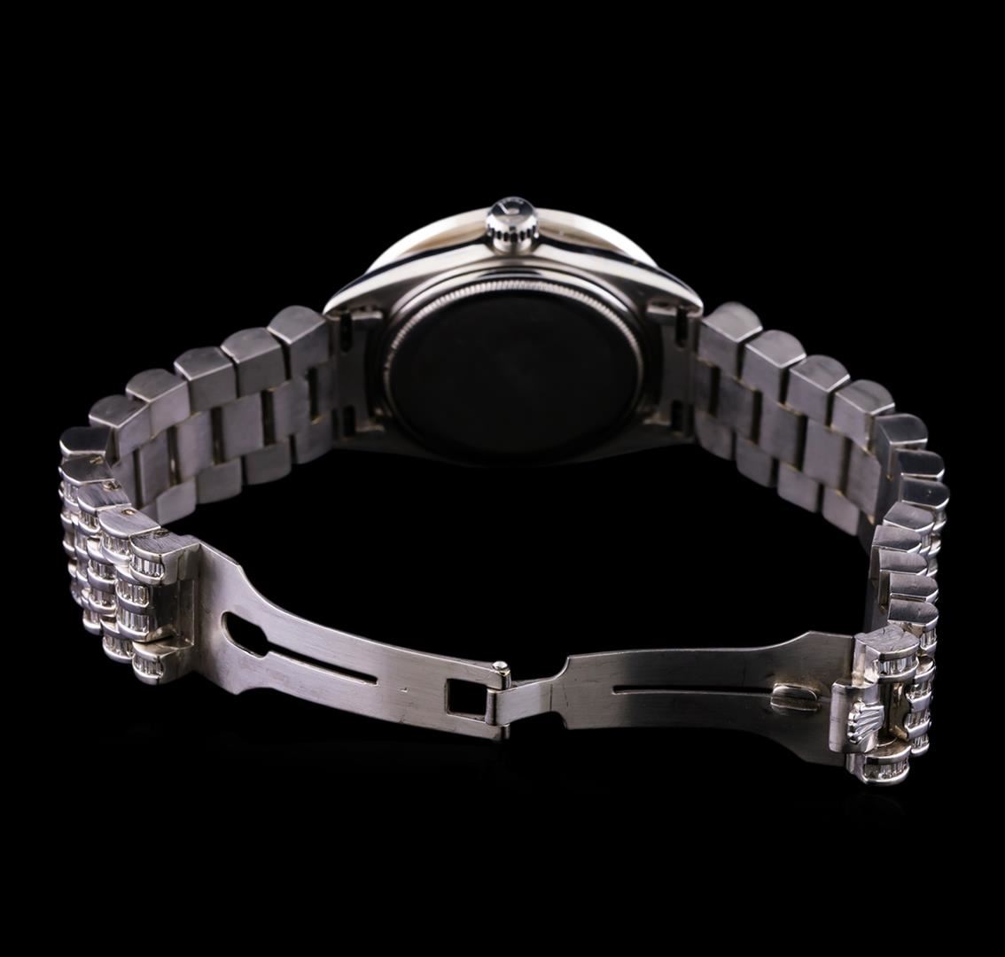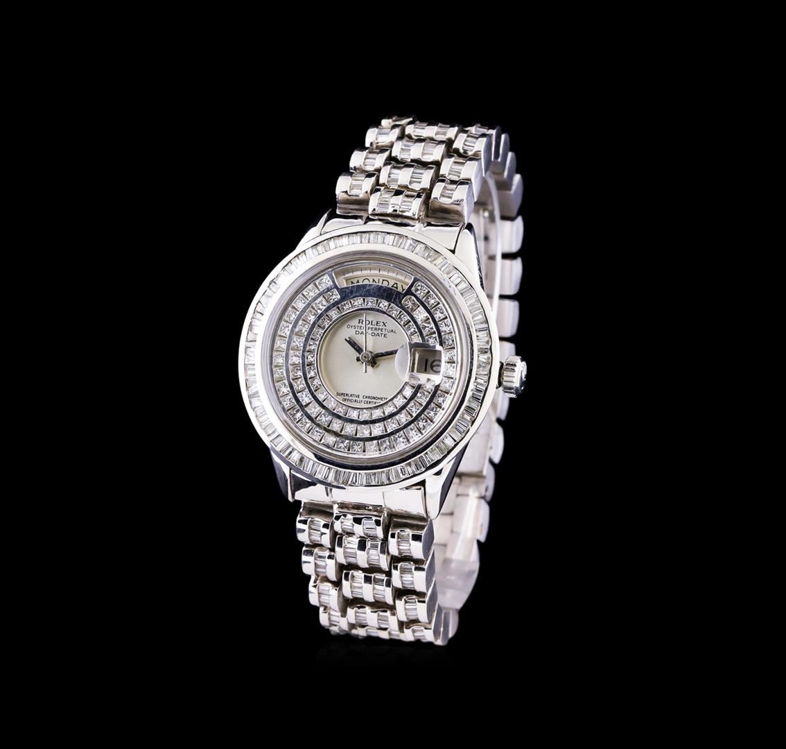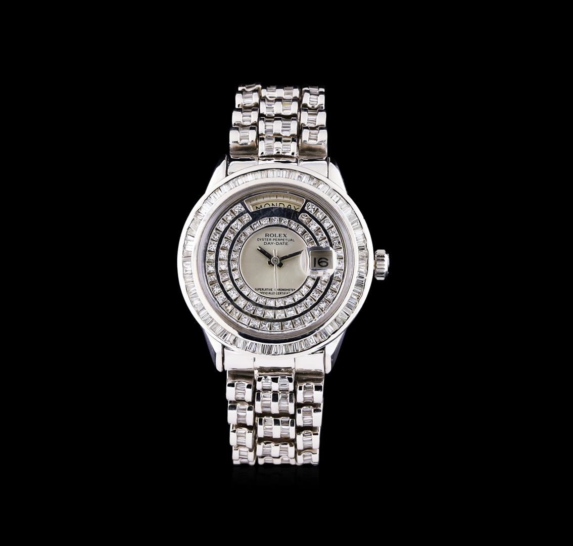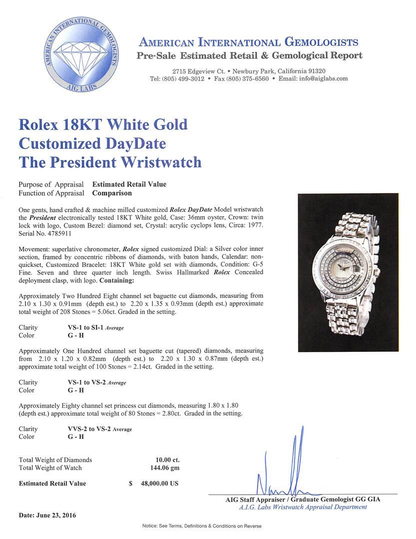 One gents, hand crafted & machine milled customized Rolex DayDate Model wristwatch the President electronically tested 18KT White gold, Case: 36mm oyster, Crown: twin lock with logo, Custom Bezel: diamond set, Crystal: acrylic cyclops lens, Circa: 1977. Serial No. 4785911Movement: superlative chronometer, Rolex signed customized Dial: a Silver color inner section, framed by concentric ribbons of diamonds, with baton hands, Calendar: non-quickset, Customized Bracelet: 18KT White gold set with diamonds, Condition: G-5 Fine. Seven and three quarter inch length. Swiss Hallmarked Rolex Concealed deployment clasp, with logo. Containing: Approximately Two Hundred Eight channel set baguette cut diamonds, measuring from 2.10 x 1.30 x 0.91mm (depth est.) to 2.20 x 1.35 x 0.93mm (depth est.) approximate total weight of 208 Stones = 5.06ct. Graded in the setting. Clarity: VS-1 to SI-1 Average. Color: G - H Approximately One Hundred channel set baguette cut (tapered) diamonds, measuring from 2.10 x 1.20 x 0.82mm (depth est.) to 2.20 x 1.30 x 0.87mm (depth est.) approximate total weight of 100 Stones = 2.14ct. Graded in the setting. Clarity: VS-1 to VS-2 Average . Color: G - H Approximately Eighty channel set princess cut diamonds, measuring 1.80 x 1.80 (depth est.) approximate total weight of 80 Stones = 2.80ct. Graded in the setting. Clarity: VVS-2 to VS-2 Average Color G - H. Total Weight of Diamonds 10.00ct.. Total Weight of Watch 144.06gm. AIG Appraised at $48,000.00.