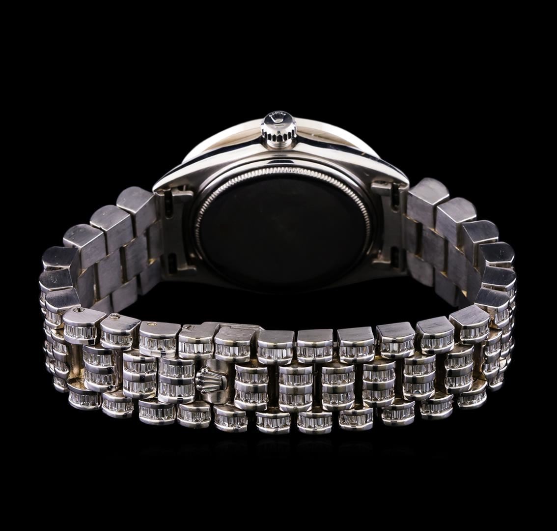 One gents, hand crafted & machine milled customized Rolex DayDate Model wristwatch the President electronically tested 18KT White gold, Case: 36mm oyster, Crown: twin lock with logo, Custom Bezel: diamond set, Crystal: acrylic cyclops lens, Circa: 1977. Serial No. 4785911Movement: superlative chronometer, Rolex signed customized Dial: a Silver color inner section, framed by concentric ribbons of diamonds, with baton hands, Calendar: non-quickset, Customized Bracelet: 18KT White gold set with diamonds, Condition: G-5 Fine. Seven and three quarter inch length. Swiss Hallmarked Rolex Concealed deployment clasp, with logo. Containing: Approximately Two Hundred Eight channel set baguette cut diamonds, measuring from 2.10 x 1.30 x 0.91mm (depth est.) to 2.20 x 1.35 x 0.93mm (depth est.) approximate total weight of 208 Stones = 5.06ct. Graded in the setting. Clarity: VS-1 to SI-1 Average. Color: G - H Approximately One Hundred channel set baguette cut (tapered) diamonds, measuring from 2.10 x 1.20 x 0.82mm (depth est.) to 2.20 x 1.30 x 0.87mm (depth est.) approximate total weight of 100 Stones = 2.14ct. Graded in the setting. Clarity: VS-1 to VS-2 Average . Color: G - H Approximately Eighty channel set princess cut diamonds, measuring 1.80 x 1.80 (depth est.) approximate total weight of 80 Stones = 2.80ct. Graded in the setting. Clarity: VVS-2 to VS-2 Average Color G - H. Total Weight of Diamonds 10.00ct.. Total Weight of Watch 144.06gm. AIG Appraised at $48,000.00.