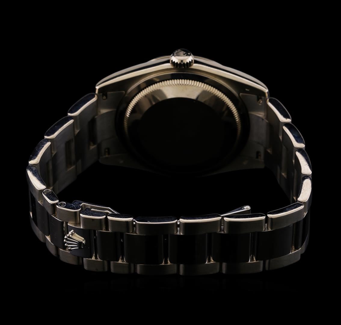 One Rolex President DayDate watch featuring: Case: 18KT white gold. Bezel: 18KT white gold. Crystal: Sapphire. Crown: Waterproof screw-down. Dial: White color; roman numeral hour markers. Features: Day window located at the 12 o'clock position; date window located at the 3 o'clock position. Bracelet: 18KT white gold.