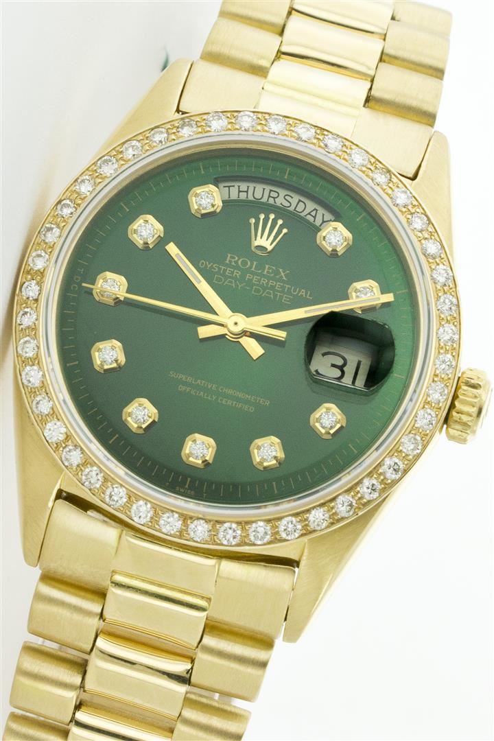 One Mens Rolex Day Date President Polished, Serviced & Electronically Tested, Yellow Gold Case:36mm. Yellow Gold Crown, Bezel: Custom 18K Yellow Gold Beadset Diamond Bezel, Diamond Count: 44Diamonds Total Weight 1.00 Carat, Clarity: SI-VS, Color: G to H. Custom Crystal: Synthetic Sapphire Cyclops Lens. Movement: Automatic Winding Movement Caliber 3055. Custom Dial: Diamond Dial With Small Track, (10 Diamonds In Dial) G To H In Color, Clarity: SI-VS. Date Window: 3 O'Clock Position Date Display, Day Display: 12 O'Clock Position. Quickset, Model: 18038. Condition: G-6 Extra Fine. Bracelet: Yellow Gold President. Bright Polish. 6.5 Inch Length, Standard President Hidden Clasp, With Rolex Logo.