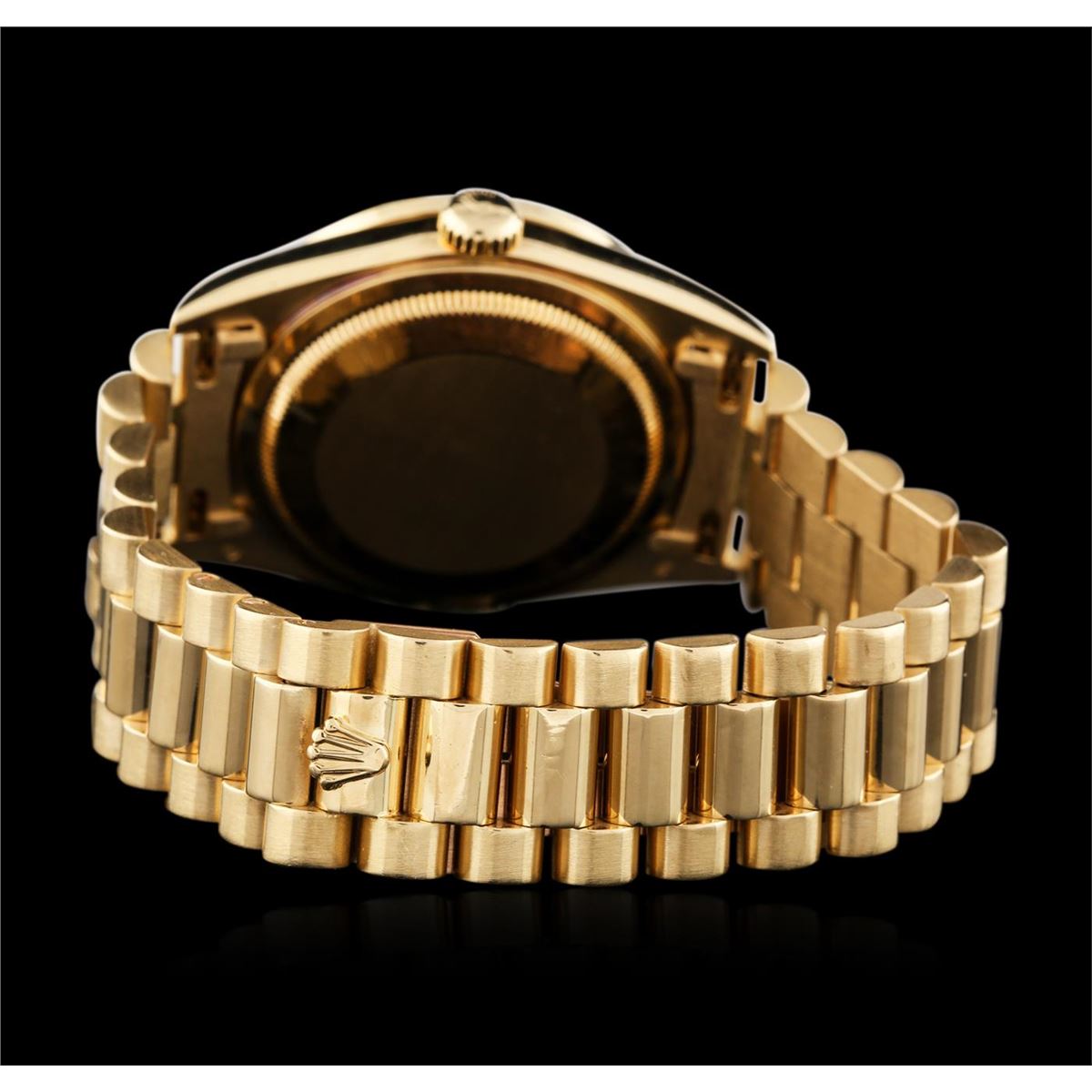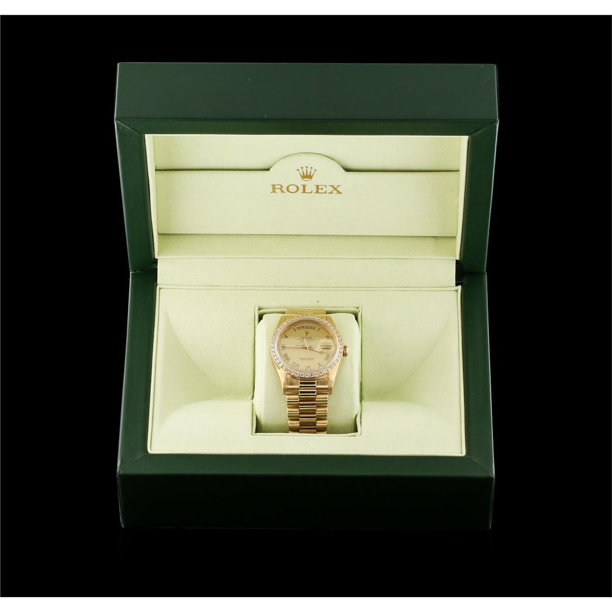 One gents, hand crafted & machine milled Rolex DayDate Model The President wristwatch electronically tested 18KT yellow gold, Case: 36mm oyster, Crown: twin lock with logo, Bezel: diamond set, Crystal: synthetic sapphire cyclops lens. Circa: 1990.Movement: superlative chronometer, Dial: Light Champagne color, baton hands & raised Roman numerals, Calendar: double quick set, Bracelet: 18KT yellow gold, bright & satin finish, Condition: G-5 Fine. Seven inch length. Concealed deployment clasp, with logo. Containing: Forty Five prong set round brilliant cut diamonds, approximate total weight equals 1.20ct. Clarity VVS-2. Color: F -H. Total Weight of Diamonds 1.20ct. Total Weight of Watch 133.87 grams. AIG Appraised at $28,050.00.