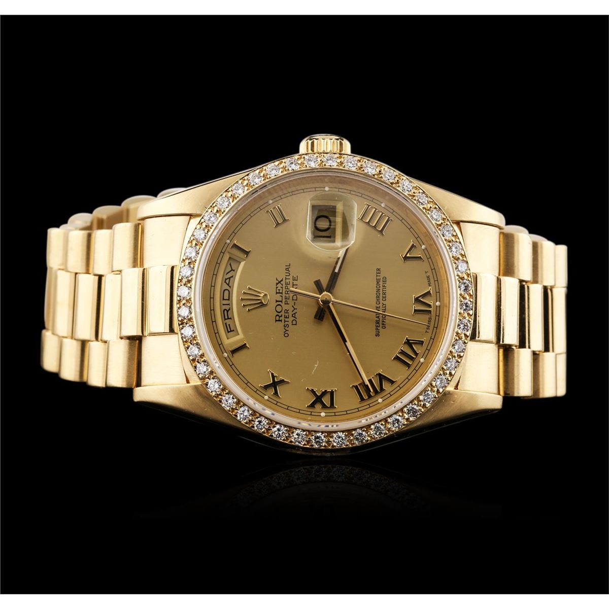 One gents, hand crafted & machine milled Rolex DayDate Model The President wristwatch electronically tested 18KT yellow gold, Case: 36mm oyster, Crown: twin lock with logo, Bezel: diamond set, Crystal: synthetic sapphire cyclops lens. Circa: 1990.Movement: superlative chronometer, Dial: Light Champagne color, baton hands & raised Roman numerals, Calendar: double quick set, Bracelet: 18KT yellow gold, bright & satin finish, Condition: G-5 Fine. Seven inch length. Concealed deployment clasp, with logo. Containing: Forty Five prong set round brilliant cut diamonds, approximate total weight equals 1.20ct. Clarity VVS-2. Color: F -H. Total Weight of Diamonds 1.20ct. Total Weight of Watch 133.87 grams. AIG Appraised at $28,050.00.