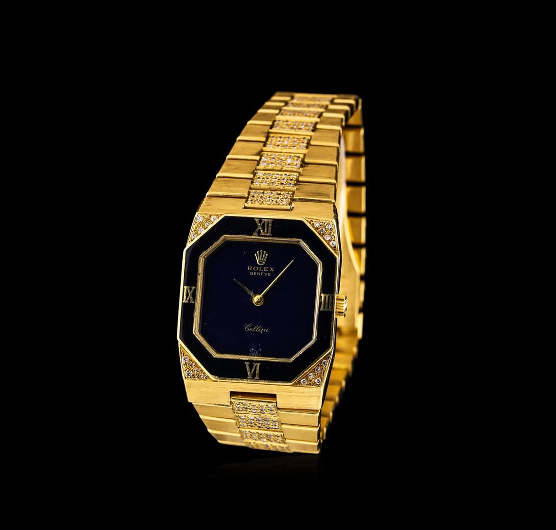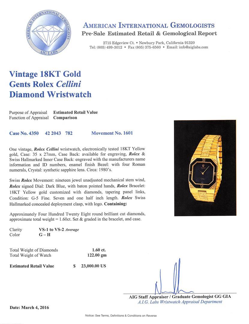 One vintage, Rolex Cellini wristwatch, electronically tested 18KT Yellow gold, Case: 35 x 27mm, Case Back: available for engraving, Rolex & Swiss Hallmarked Inner Case Back: engraved with the manufacturers name information and ID numbers, enamel finish Bezel: with four Roman numerals, Crystal: synthetic sapphire lens. Circa: 1980's.Swiss Rolex Movement: nineteen jewel unadjusted mechanical stem wind, Rolex signed Dial: Dark Blue, with baton pointed hands, Rolex Bracelet: 18KT Yellow gold customized with diamonds, tapering panel links, Condition: G-5 Fine. Seven and one half inch length. Rolex Swiss Hallmarked concealed deployment clasp, with logo. Containing: Approximately Four Hundred Twenty Eight round brilliant cut diamonds, approximate total weight = 1.60ct. Set & graded in the bracelet, and case. Clarity VS-1 to VS-2 Average. Color: G - H. Total Weight of Diamonds 1.60ct. Total Weight of Watch 122.00gm. AIG Appraised at $23,000.00.
