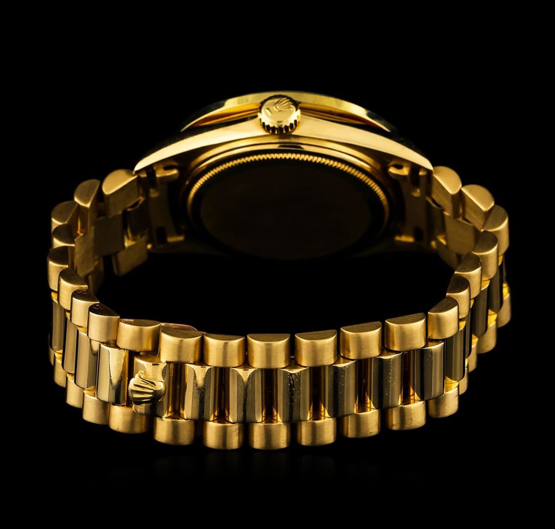 One gents, hand crafted & machine milled Rolex DayDate Model wristwatch electronically tested 18KT yellow gold, Case: 36mm oyster, Crown: twin lock with logo, Custom Bezel: diamond set, Custom Crystal: synthetic sapphire cyclops lens, Circa 1969. Movement: superlative chronometer, Custom Dial: Flat Black color, with baton hands, & diamond markers, Calendar: non-quick set, Bracelet: 18KT yellow gold, bright polish & brushed finish, Condition: G-4 Average. Seven inch length. Concealed deployment clasp, with logo Containing: Forty Two prong set round brilliant cut diamonds, approximate total weight equals 2.00ct. Set & graded in the bezel. Clarity: SI-1 to I-1. Color: G - I. Total Weight of Diamonds 2.00ct. Total Weight of Watch 119.52 grams. AIG Appraised at $23,990.00.