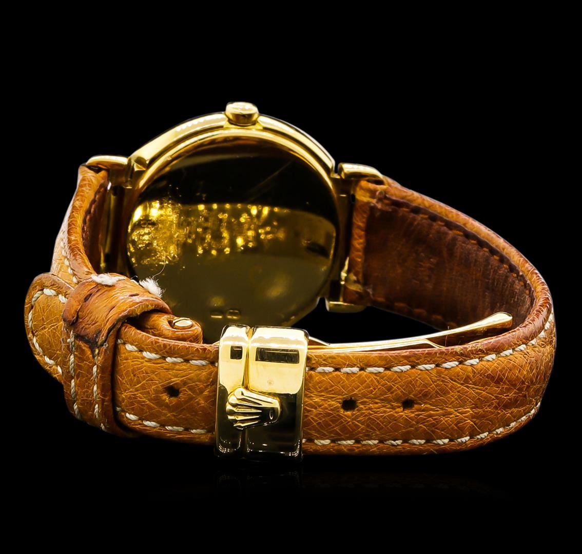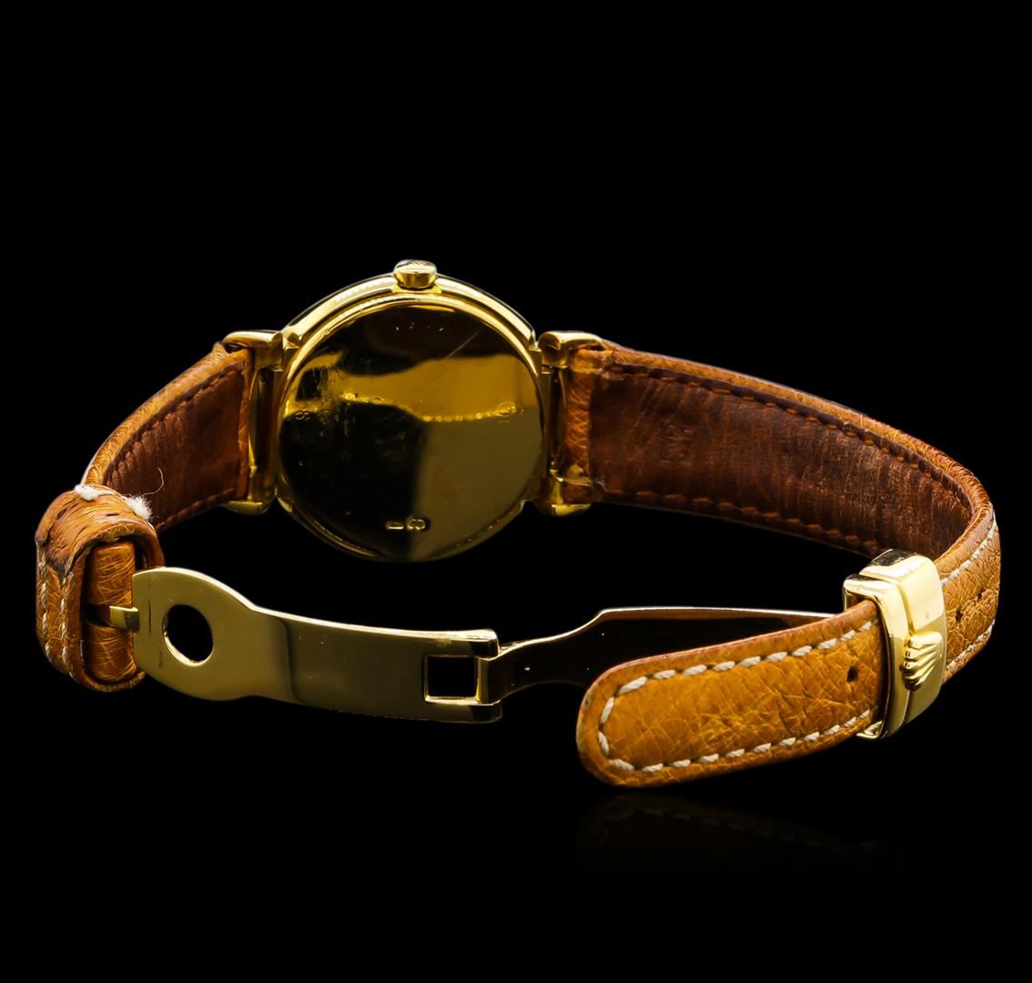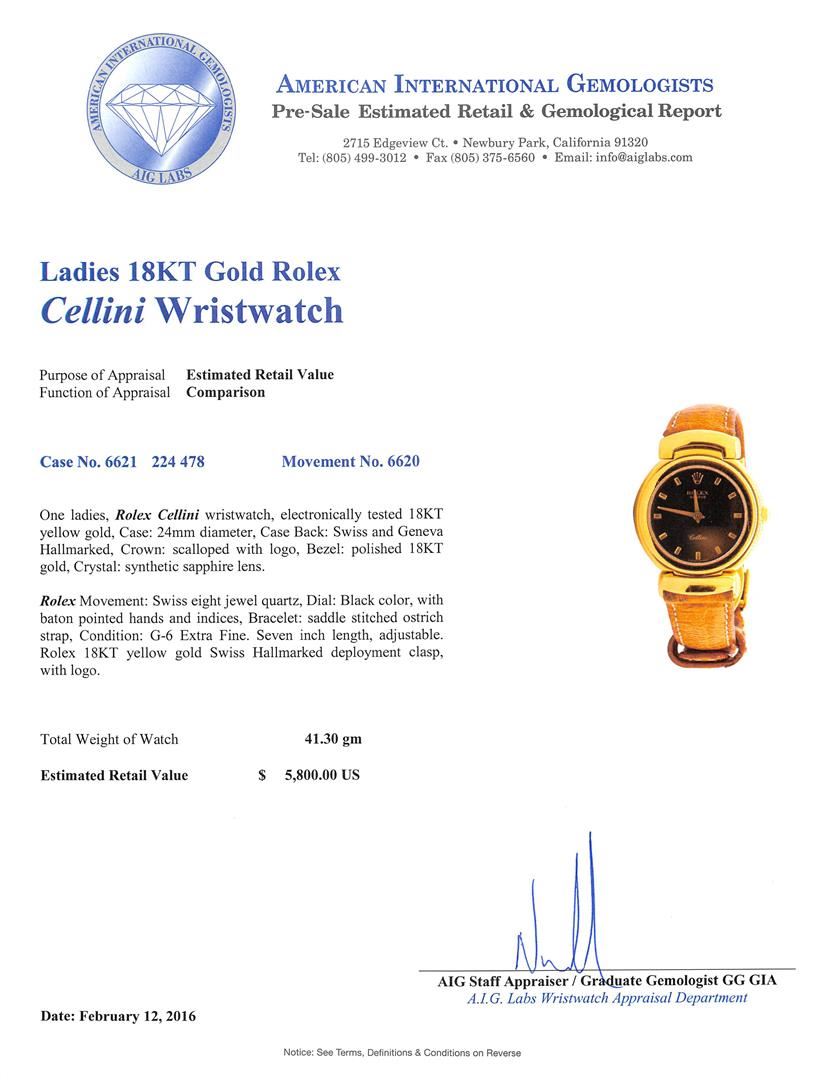 One ladies, Rolex Cellini wristwatch, electronically tested 18KT yellow gold, Case: 24mm diameter, Case Back: Swiss and Geneva Hallmarked, Crown: scalloped with logo, Bezel: polished 18KT gold, Crystal: synthetic sapphire lens. Rolex Movement: Swiss eight jewel quartz, Dial: Black color, with baton pointed hands and indices, Bracelet: saddle stitched ostrich strap, Condition: G-6 Extra Fine. Seven inch length, adjustable. Rolex 18KT yellow gold Swiss Hallmarked deployment clasp, with logo. Total Weight of Watch 41.30gm. AIG Appraised at $5,800.00.