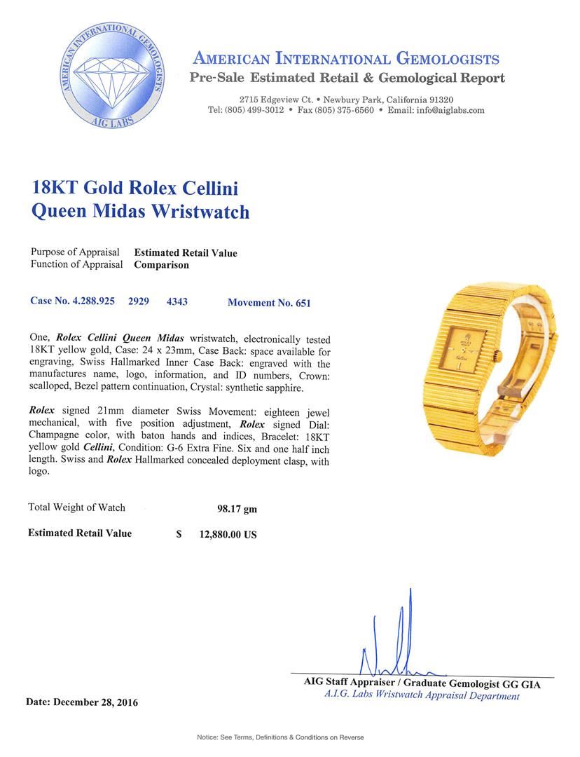 One, Rolex Cellini Queen Midas wristwatch, electronically tested 18KT yellow gold, Case: 24 x 23mm, Case Back: space available for engraving, Swiss Hallmarked Inner Case Back: engraved with the manufactures name, logo, information, and ID numbers, Crown: scalloped, Bezel pattern continuation, Crystal: synthetic sapphire. Rolex signed 21mm diameter Swiss Movement: eighteen jewel mechanical, with five position adjustment, Rolex signed Dial: Champagne color, with baton hands and indices, Bracelet: 18KT yellow gold Cellini, Condition: G-6 Extra Fine. Six and one half inch length. Swiss and Rolex Hallmarked concealed deployment clasp, with logo. Total Weight of Watch 98.17gm. AIG Appraised at $12,880.00.