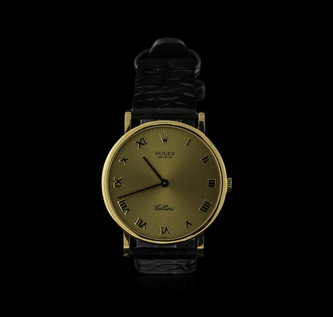 One, Rolex Cellini Classic wristwatch, electronically tested 18KT yellow gold, Case: 32mm diameter, flat profile, Swiss Hallmarked Case Back: engraved with the manufacturers ID numbers, Bezel: polished, Crystal: synthetic sapphire lens, Movement: Swiss mechanical, Circa: 1995.Dial: Champagne color, with baton hands and Roman numerals, Bracelet: Black leather strap, Condition: G-5 fine. Seven and one half inch length, adjustable. Rolex 18KT yellow gold Swiss Hallmarked buckle, with logo. Total Weight of Watch 41.40gm. AIG Appraised at $4,980.00.