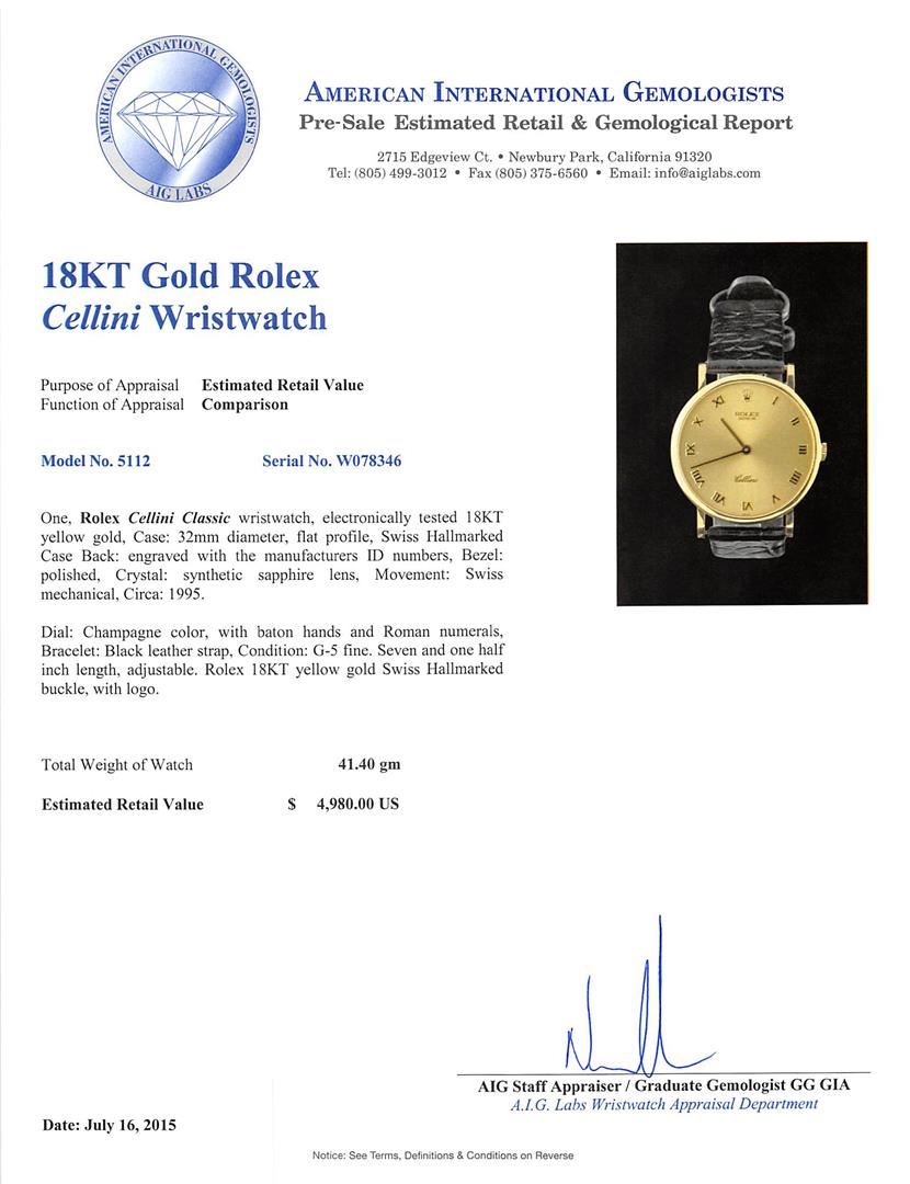 One, Rolex Cellini Classic wristwatch, electronically tested 18KT yellow gold, Case: 32mm diameter, flat profile, Swiss Hallmarked Case Back: engraved with the manufacturers ID numbers, Bezel: polished, Crystal: synthetic sapphire lens, Movement: Swiss mechanical, Circa: 1995.Dial: Champagne color, with baton hands and Roman numerals, Bracelet: Black leather strap, Condition: G-5 fine. Seven and one half inch length, adjustable. Rolex 18KT yellow gold Swiss Hallmarked buckle, with logo. Total Weight of Watch 41.40gm. AIG Appraised at $4,980.00.