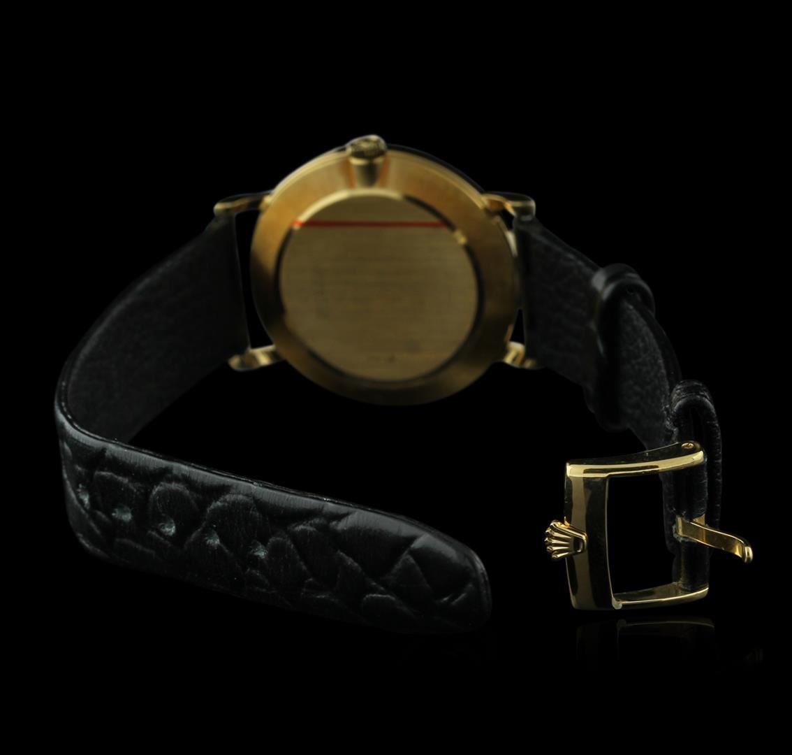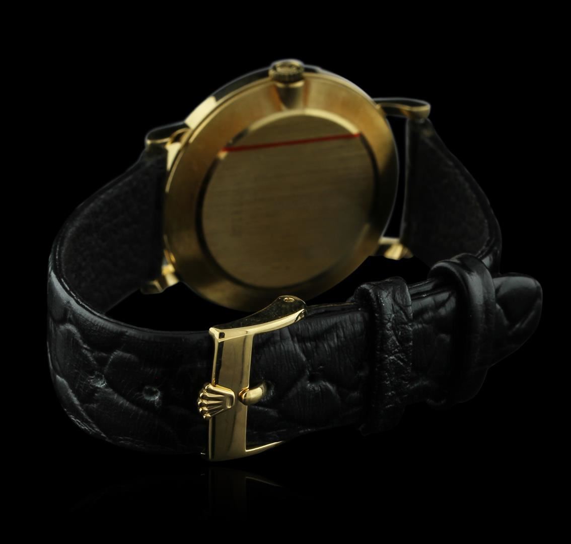 One, Rolex Cellini Classic wristwatch, electronically tested 18KT yellow gold, Case: 32mm diameter, flat profile, Swiss Hallmarked Case Back: engraved with the manufacturers ID numbers, Bezel: polished, Crystal: synthetic sapphire lens, Movement: Swiss mechanical, Circa: 1995.Dial: Champagne color, with baton hands and Roman numerals, Bracelet: Black leather strap, Condition: G-5 fine. Seven and one half inch length, adjustable. Rolex 18KT yellow gold Swiss Hallmarked buckle, with logo. Total Weight of Watch 41.40gm. AIG Appraised at $4,980.00.