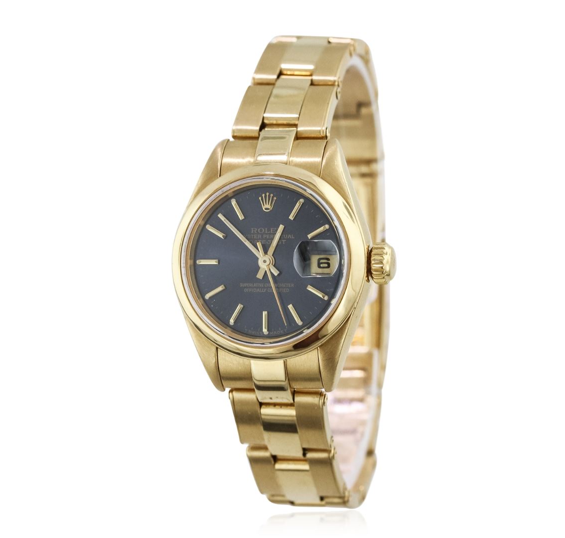 One ladies, hand crafted & machine milled Rolex DateJust model wristwatch electronically tested 18KT yellow gold, Case: 26mm oyster, Crown: twinlock, with logo, Bezel: high polish, Custom Crystal: synthetic sapphire cyclops lens. Movement: superlative chronometer, Dial: Royal Blue, Bracelet: 18KT yellow gold tapering oyster, Condition: G-5 Fine. Circa: 1995, Bright polish and brushed finish. Six and one half inch length, adjustable. Standard clasp, with logo. Total Weight of Watch 63.33 grams. AIG Appraised at $16,880.00.