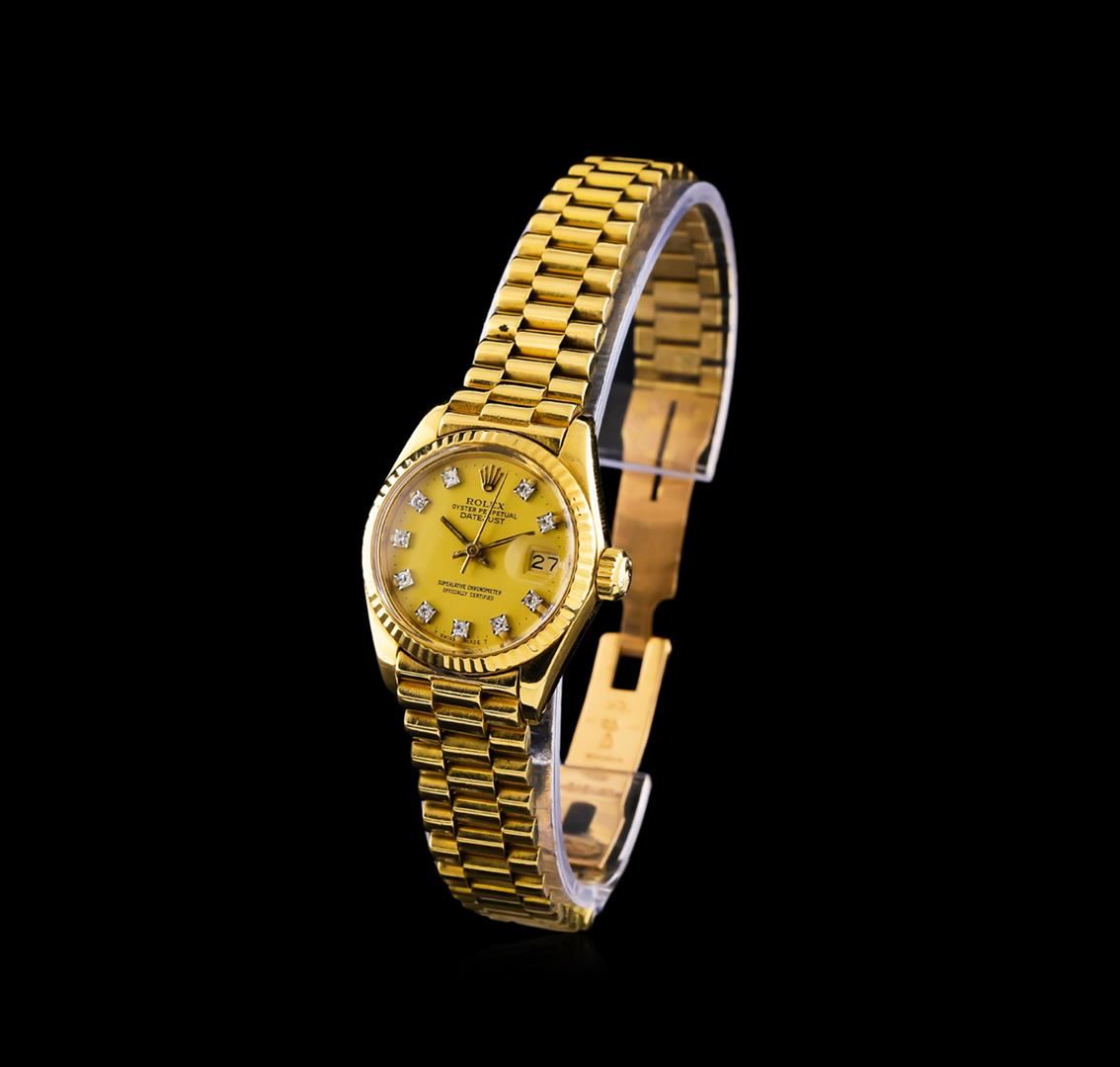 One ladies, hand crafted & machine milled Rolex DateJust model, wristwatch electronically tested 18KT yellow gold, Circa: 1977, Swiss Hallmarked Case: 26mm oyster, Case Back: space available for engraving, Crown: twinlock with logo, Bezel: fluted, Crystal: acrylic cyclops lens. Movement: automatic, Customized Rolex signed Dial: Champagne color, baton hands, and diamond markers, Date Display: 3 o'clock position, non-quick set, Rolex Bracelet: 18KT yellow gold, bright polish finish, Condition: G-5 Fine. Six inch length. Rolex and Swiss Hallmarked concealed clasp, with logo. Total Weight of Watch 63.36gm. AIG Appraised at $16,050.00.