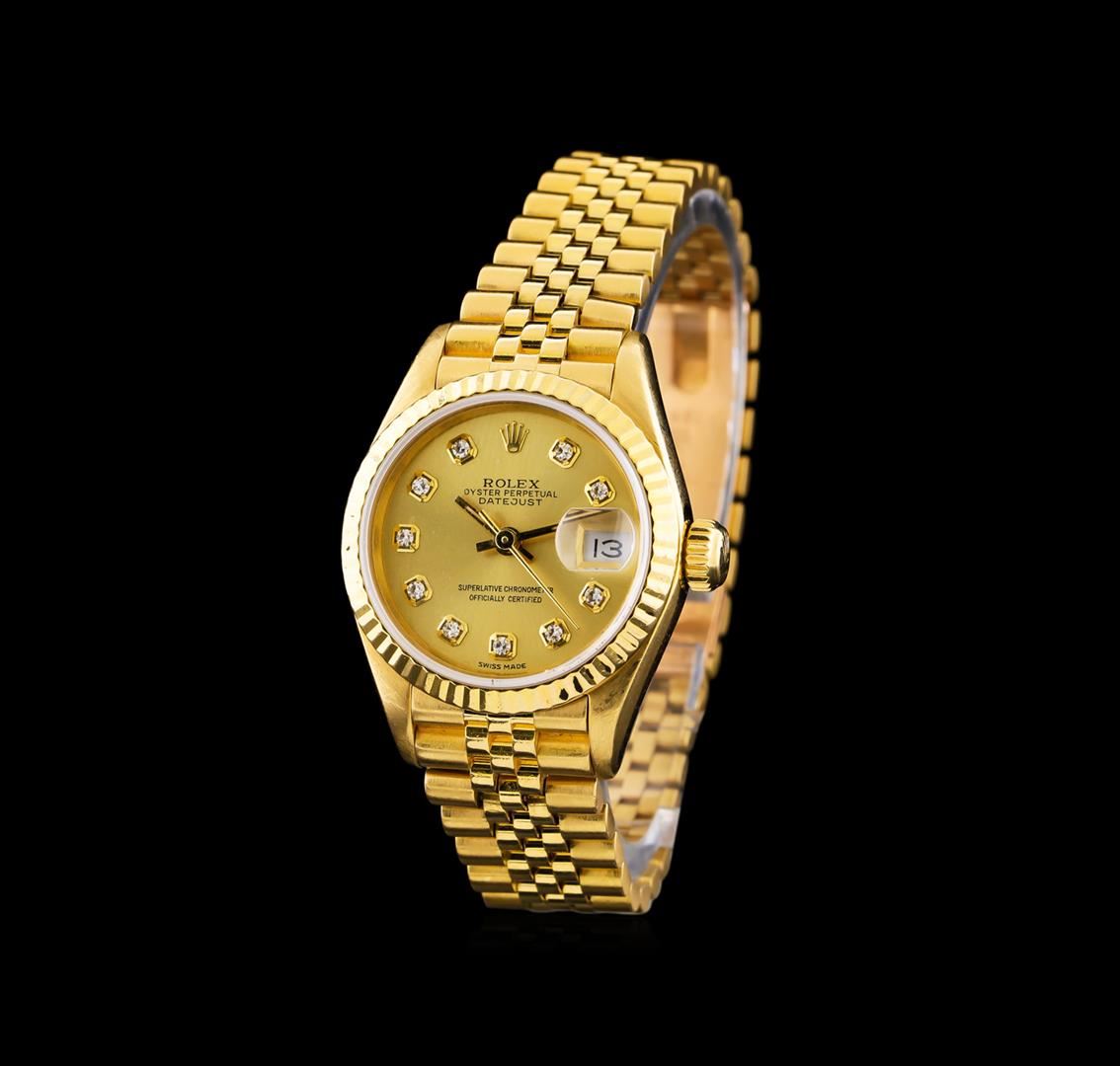One Rolex DateJust ladies watch featuring: Case: 18KT yellow gold. Bezel: 18KT yellow gold fluted. Crystal: Scratch-resistant sapphire. Dial: Gold color; diamond index hour markers. Features: Date window located at the 3 o'clock position. Bracelet: 18KT yellow gold. Condition: Minor surface scratches on case back, but otherwise there are no major signs of wear.