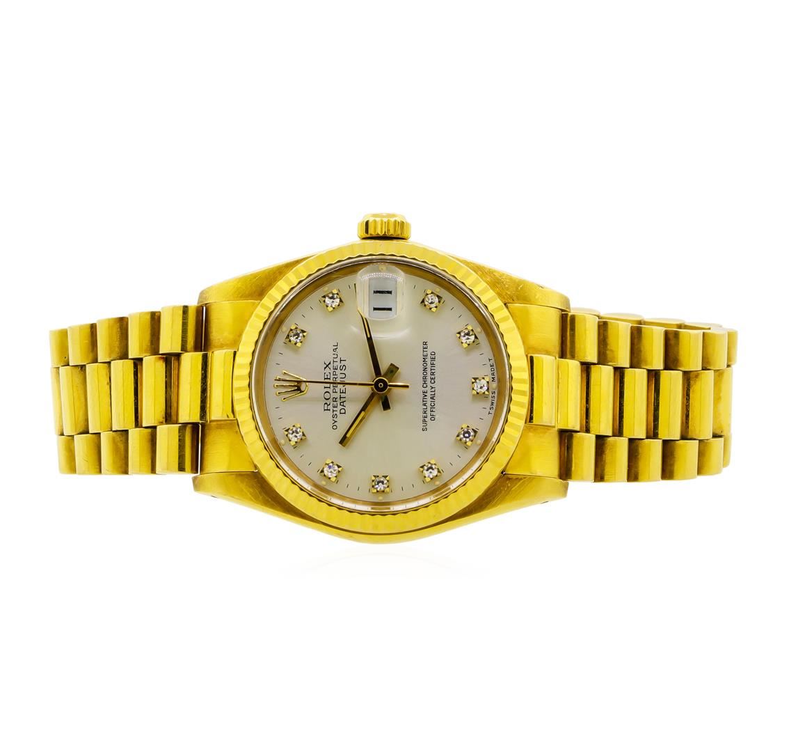 One gents, hand crafted & machine milled Rolex Mid-Size DateJust Model wristwatch, electronically tested 18KT yellow gold, Swiss Hallmarked Case: 30mm oyster, Rolex Signature Crown: twin lock with logo, Bezel: fluted, Custom Crystal: acrylic cyclops lens, Movement: superlative chronometer. Circa: 1982.Rolex signed Dial: Silver color, with baton hands, and diamond markers, Calendar: 3 o'clock position, non-quick set, Rolex Bracelet: 18KT yellow gold, bright polish & satin finish, Condition: G-6 Extra Fine. Six and one half inch length. Swiss Hallmarked Rolex concealed clasp, with logo. Total Weight of Watch 90.46gm. AIG Appraised at $14,880.00.