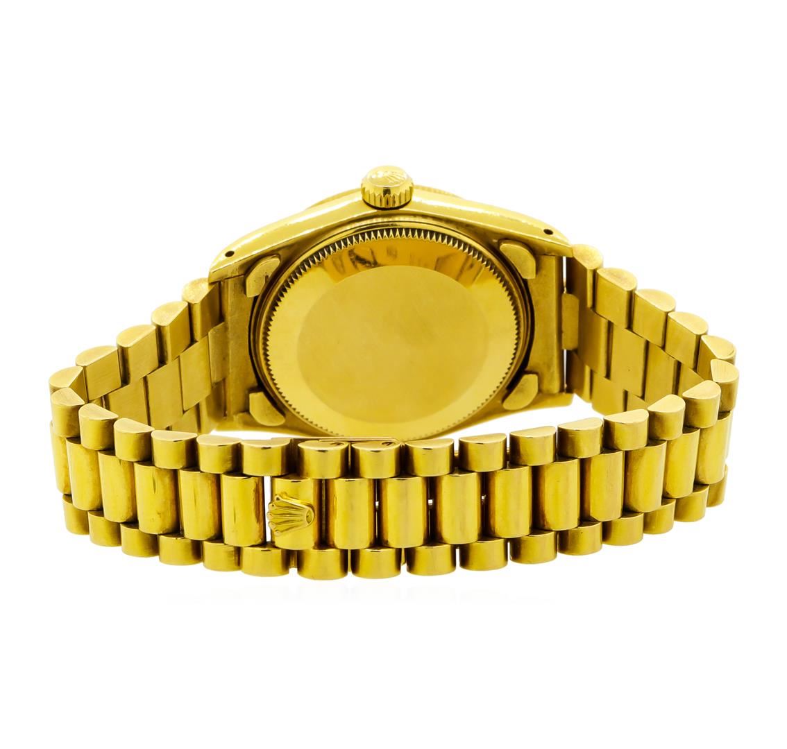 One gents, hand crafted & machine milled Rolex Mid-Size DateJust Model wristwatch, electronically tested 18KT yellow gold, Swiss Hallmarked Case: 30mm oyster, Rolex Signature Crown: twin lock with logo, Bezel: fluted, Custom Crystal: acrylic cyclops lens, Movement: superlative chronometer. Circa: 1982.Rolex signed Dial: Silver color, with baton hands, and diamond markers, Calendar: 3 o'clock position, non-quick set, Rolex Bracelet: 18KT yellow gold, bright polish & satin finish, Condition: G-6 Extra Fine. Six and one half inch length. Swiss Hallmarked Rolex concealed clasp, with logo. Total Weight of Watch 90.46gm. AIG Appraised at $14,880.00.