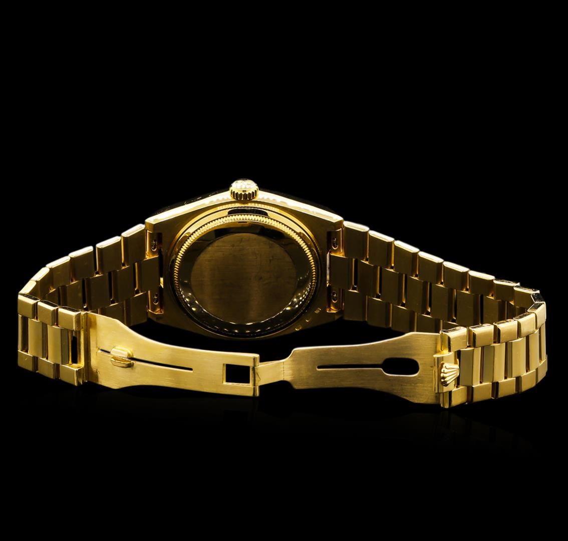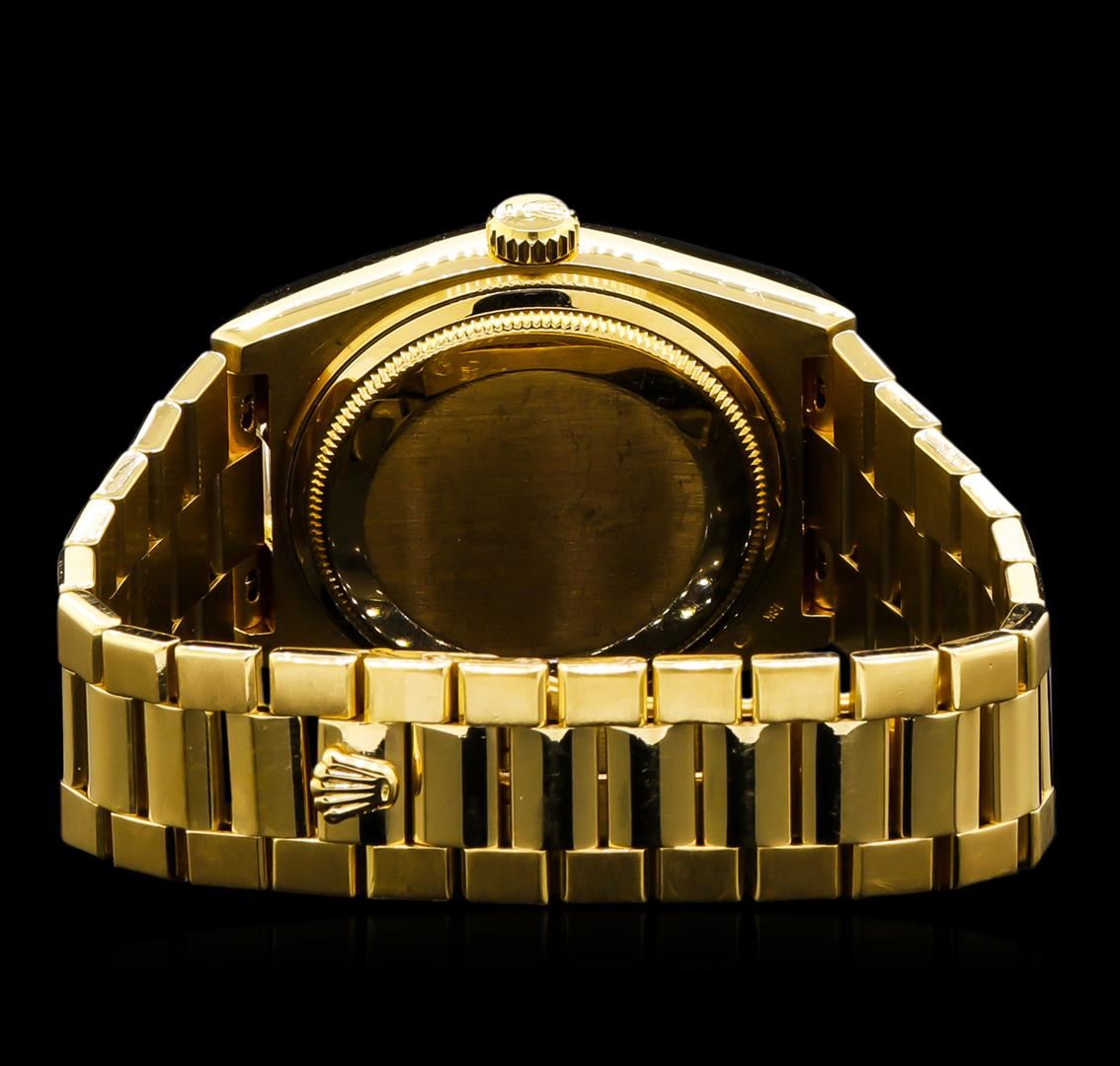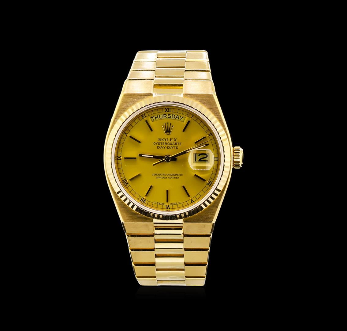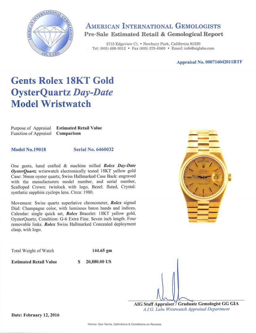 One gents, hand crafted & machine milled Rolex Day-Date OysterQuartz wristwatch electronically tested 18KT yellow gold Case: 36mm oyster quartz, Swiss Hallmarked Case Back: engraved with the manufacturers model number, and serial number, Scalloped Crown: twinlock with logo, Bezel: fluted, Crystal: synthetic sapphire cyclops lens. Circa: 1980.Movement: Swiss quartz superlative chronometer, Rolex signed Dial: Champagne color, with luminous baton hands and indices, Calendar: single quick set, Rolex Bracelet: 18KT yellow gold, OysterQuartz, Condition: G-6 Extra Fine. Seven inch length. Four removable links. Rolex Swiss Hallmarked Concealed deployment clasp, with logo. Total Weight of Watch 144.65gm. AIG Appraised at $20,880.00.