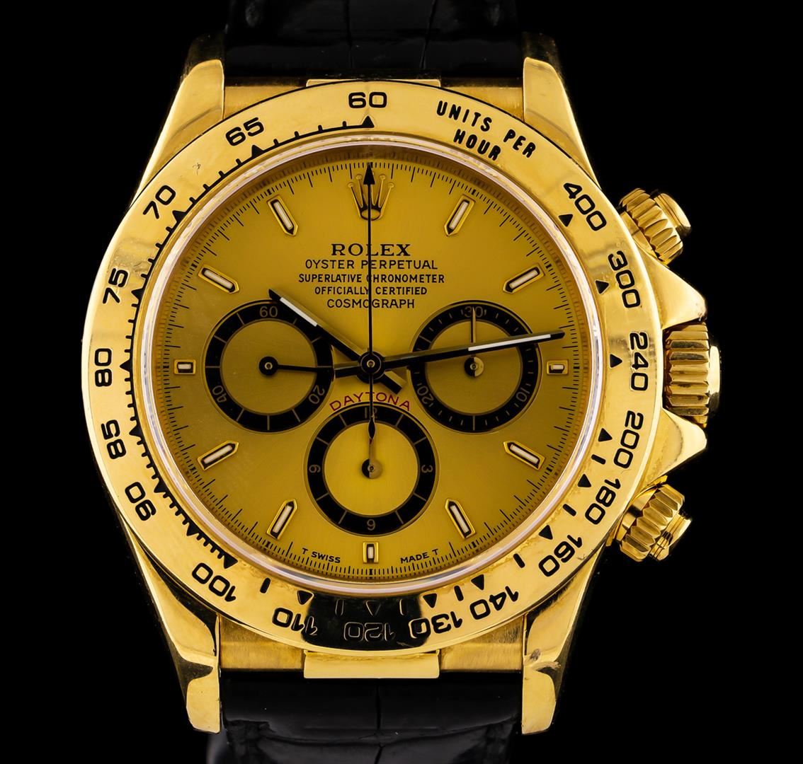 One, hand crafted & machine milled Rolex 18KT Yellow gold Daytona Cosmograph wristwatch electronically tested, Swiss Hallmarked Case: 40mm oyster, Crown: twin lock with logo, set within protective shoulders, Bezel: fixed, with engraved Tachymeter scale, Crystal: synthetic sapphire lens. Movement: superlative chronometer, Rolex signed Dial: Champagne color, with baton hands, & indices, Sub Dials: Black ringed Gold color chronograph sub dials at the 3 and 9 o'clock positions; continuous seconds sub dial at the 6 o'clock position. Rolex Bracelet: Black saddle stitched leather strap completed by an 18KT Yellow gold Swiss Hallmarked Rolex deployment flip lock clasp with logo, Condition: G-6 extra fine. Circa: 1991, Eight inch length, adjustable. Total Weight of Watch 119.41gm. AIG Appraised at $22,000.00.