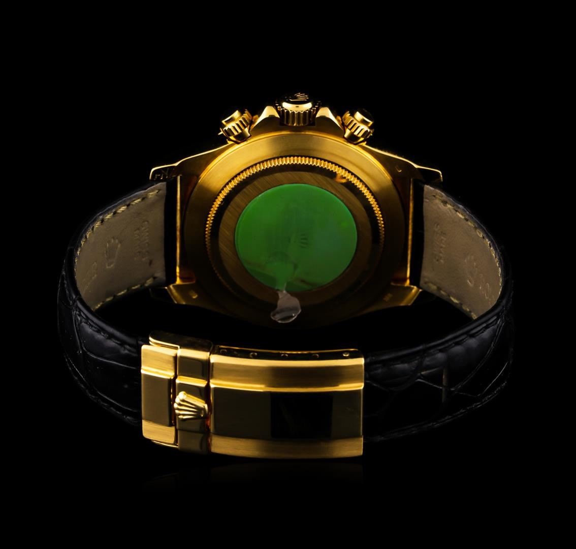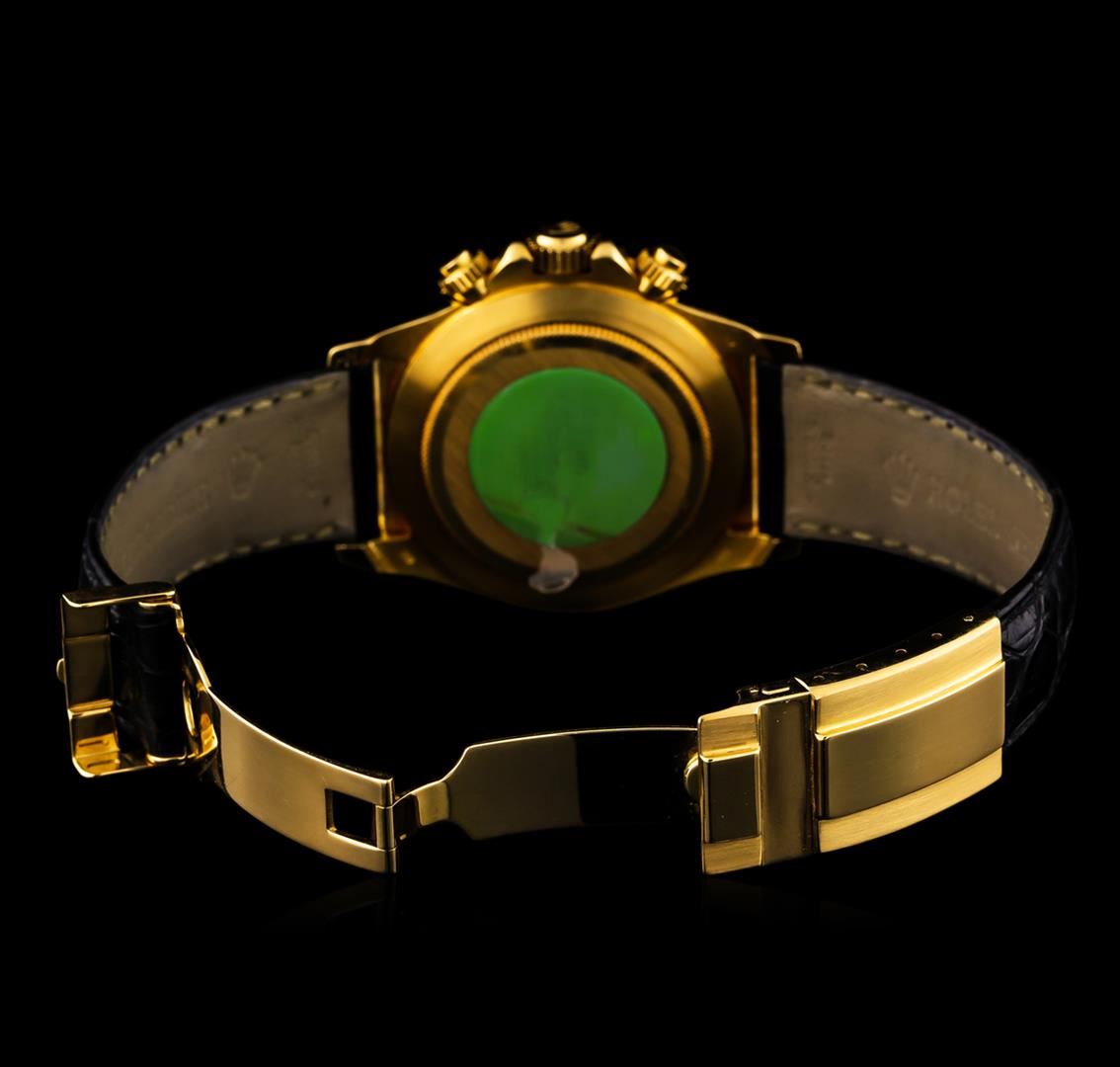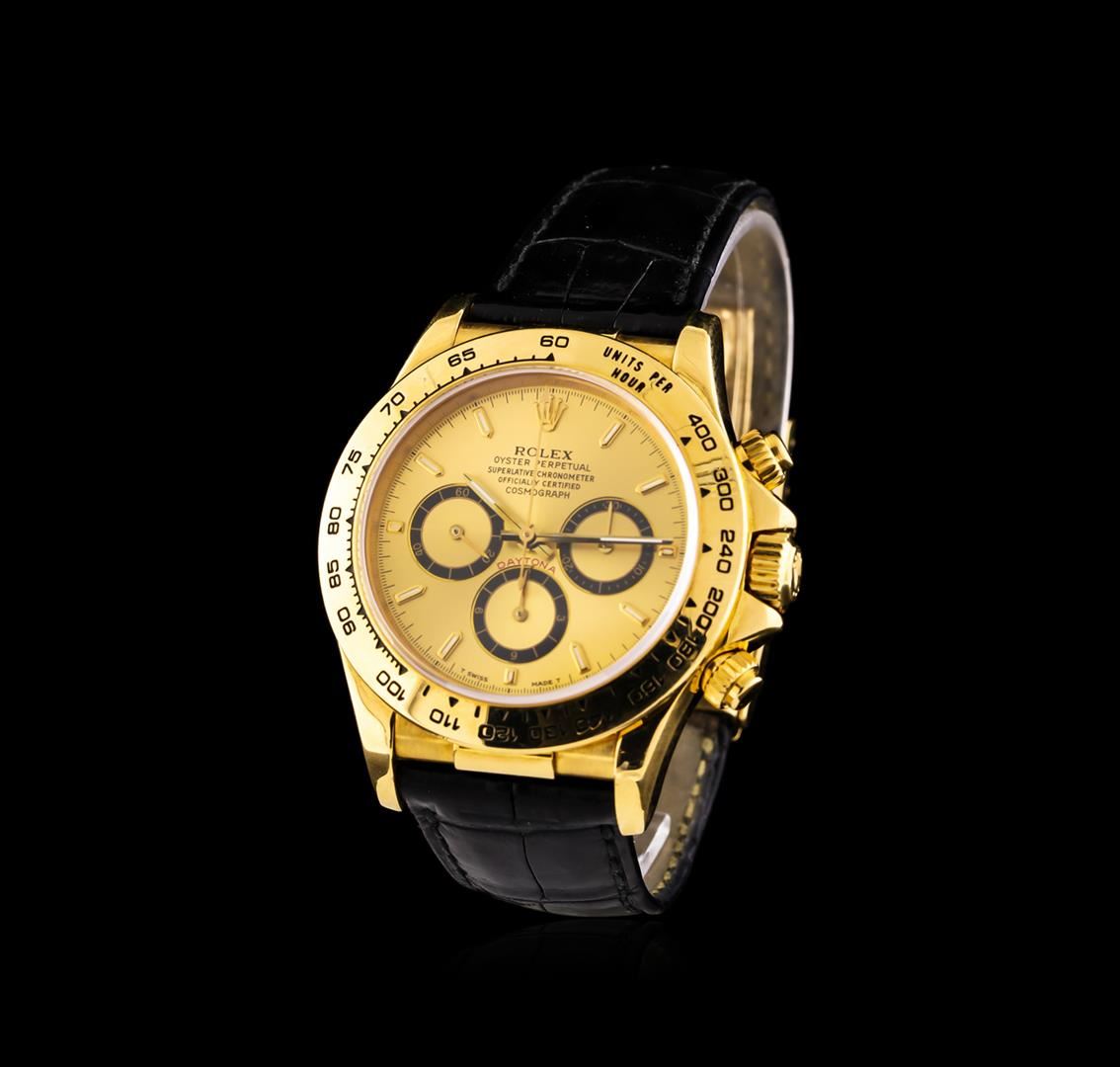 One, hand crafted & machine milled Rolex 18KT Yellow gold Daytona Cosmograph wristwatch electronically tested, Swiss Hallmarked Case: 40mm oyster, Crown: twin lock with logo, set within protective shoulders, Bezel: fixed, with engraved Tachymeter scale, Crystal: synthetic sapphire lens. Movement: superlative chronometer, Rolex signed Dial: Champagne color, with baton hands, & indices, Sub Dials: Black ringed Gold color chronograph sub dials at the 3 and 9 o'clock positions; continuous seconds sub dial at the 6 o'clock position. Rolex Bracelet: Black saddle stitched leather strap completed by an 18KT Yellow gold Swiss Hallmarked Rolex deployment flip lock clasp with logo, Condition: G-6 extra fine. Circa: 1991, Eight inch length, adjustable. Total Weight of Watch 119.41gm. AIG Appraised at $22,000.00.
