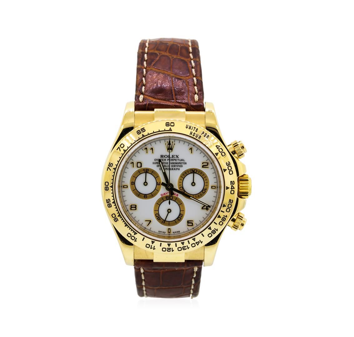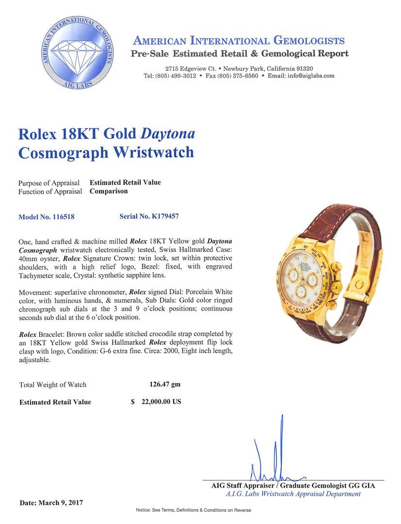 One, hand crafted & machine milled Rolex 18KT Yellow gold Daytona Cosmograph wristwatch electronically tested, Swiss Hallmarked Case: 40mm oyster, Rolex Signature Crown: twin lock, set within protective shoulders, with a high relief logo, Bezel: fixed, with engraved Tachymeter scale, Crystal: synthetic sapphire lens. Movement: superlative chronometer, Rolex signed Dial: Porcelain White color, with luminous hands, & numerals, Sub Dials: Gold color ringed chronograph sub dials at the 3 and 9 o'clock positions; continuous seconds sub dial at the 6 o'clock position. Rolex Bracelet: Brown color saddle stitched crocodile strap completed by an 18KT Yellow gold Swiss Hallmarked Rolex deployment flip lock clasp with logo, Condition: G-6 extra fine. Circa: 2000, Eight inch length, adjustable. Total Weight of Watch 126.47gm. AIG Appraised at $22,000.00.