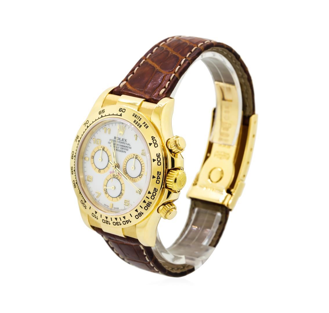One, hand crafted & machine milled Rolex 18KT Yellow gold Daytona Cosmograph wristwatch electronically tested, Swiss Hallmarked Case: 40mm oyster, Rolex Signature Crown: twin lock, set within protective shoulders, with a high relief logo, Bezel: fixed, with engraved Tachymeter scale, Crystal: synthetic sapphire lens. Movement: superlative chronometer, Rolex signed Dial: Porcelain White color, with luminous hands, & numerals, Sub Dials: Gold color ringed chronograph sub dials at the 3 and 9 o'clock positions; continuous seconds sub dial at the 6 o'clock position. Rolex Bracelet: Brown color saddle stitched crocodile strap completed by an 18KT Yellow gold Swiss Hallmarked Rolex deployment flip lock clasp with logo, Condition: G-6 extra fine. Circa: 2000, Eight inch length, adjustable. Total Weight of Watch 126.47gm. AIG Appraised at $22,000.00.