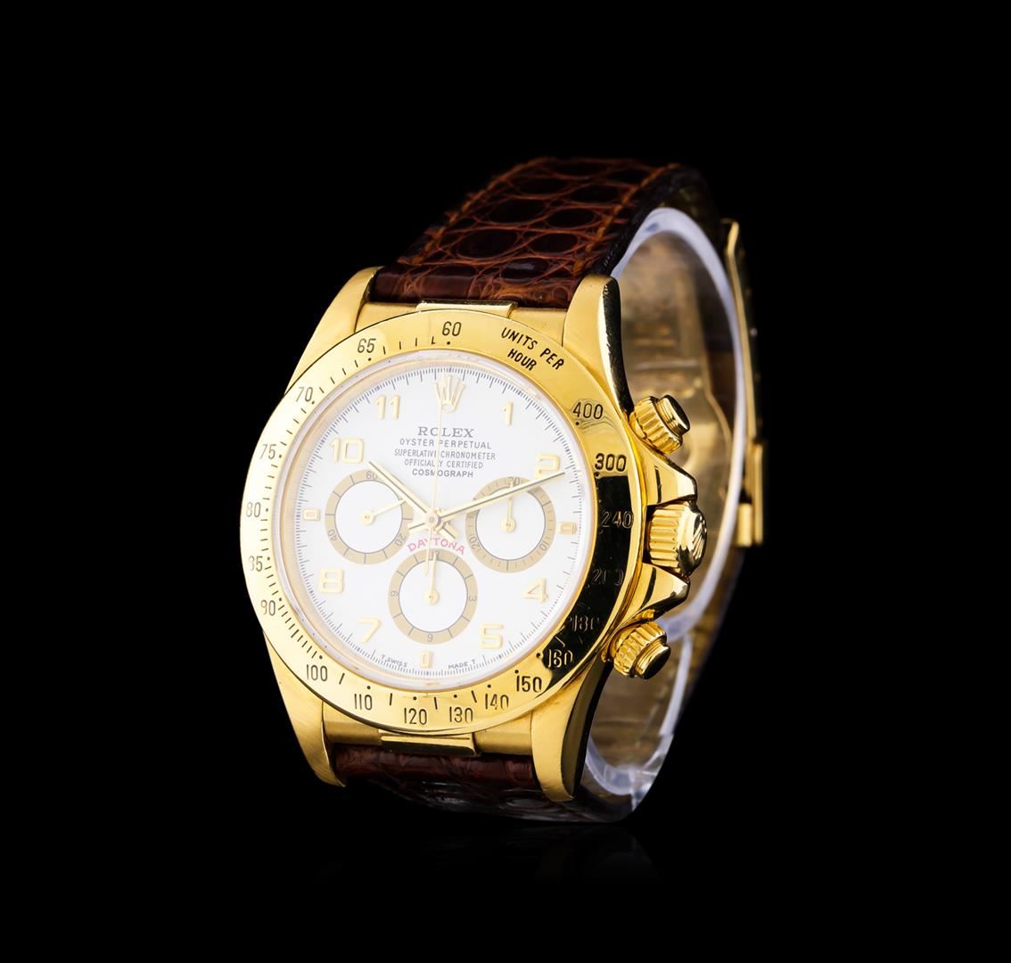 One Rolex Daytona men's watch featuring: Movement: Automatic. Case: 18KT yellow gold. Bezel: 18KT yellow gold engraved tachymeter. Crystal: Scratch-resistant sapphire. Dial: White color; gold hour numerals; gold sub-dials. Features: Chronograph; waterproof screw-down crown. Bracelet: Brown Rolex genuine crocodile strap with 18KT yellow gold deployment clasp. Condition: Barely noticeable surface scratches on clasp, but otherwise there are no major signs of wear.