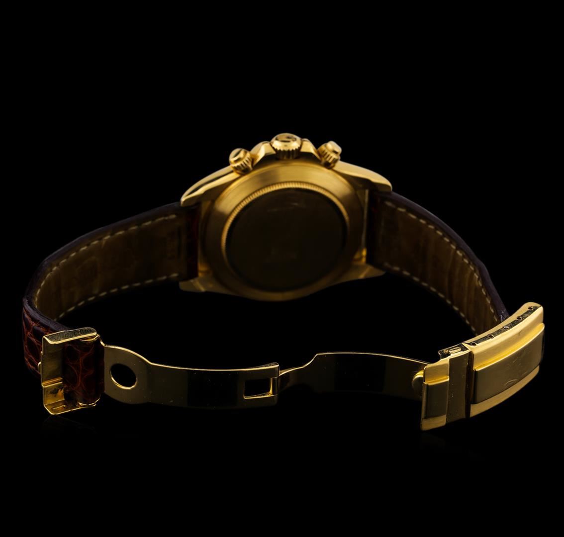 One Rolex Daytona men's watch featuring: Movement: Automatic. Case: 18KT yellow gold. Bezel: 18KT yellow gold engraved tachymeter. Crystal: Scratch-resistant sapphire. Dial: White color; gold hour numerals; gold sub-dials. Features: Chronograph; waterproof screw-down crown. Bracelet: Brown Rolex genuine crocodile strap with 18KT yellow gold deployment clasp. Condition: Barely noticeable surface scratches on clasp, but otherwise there are no major signs of wear.
