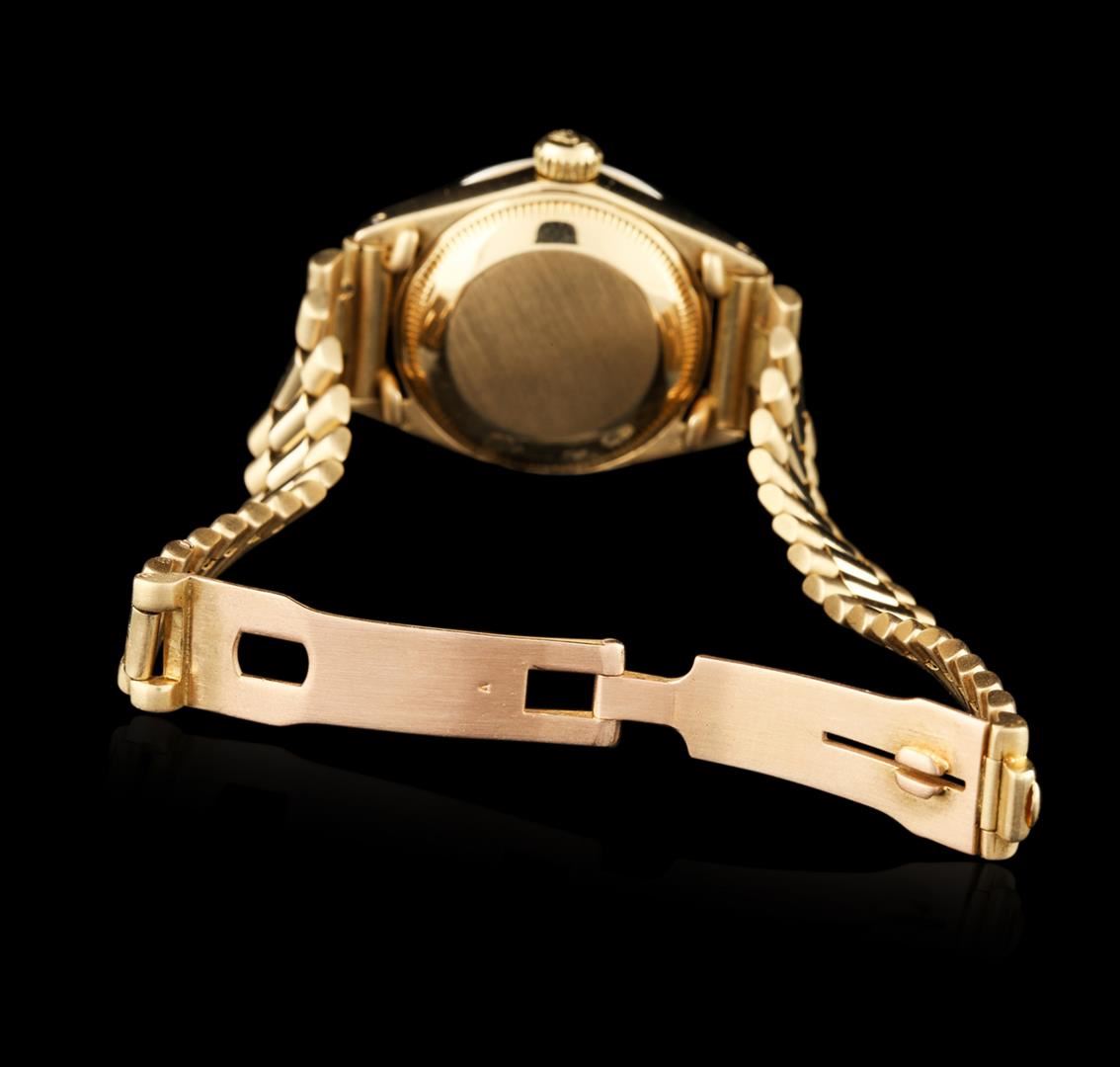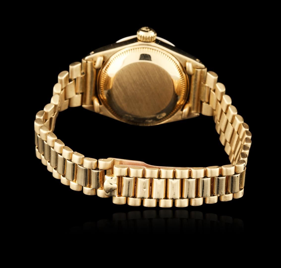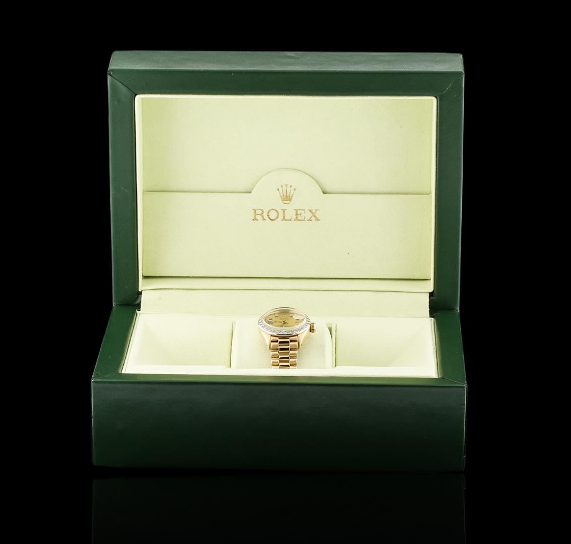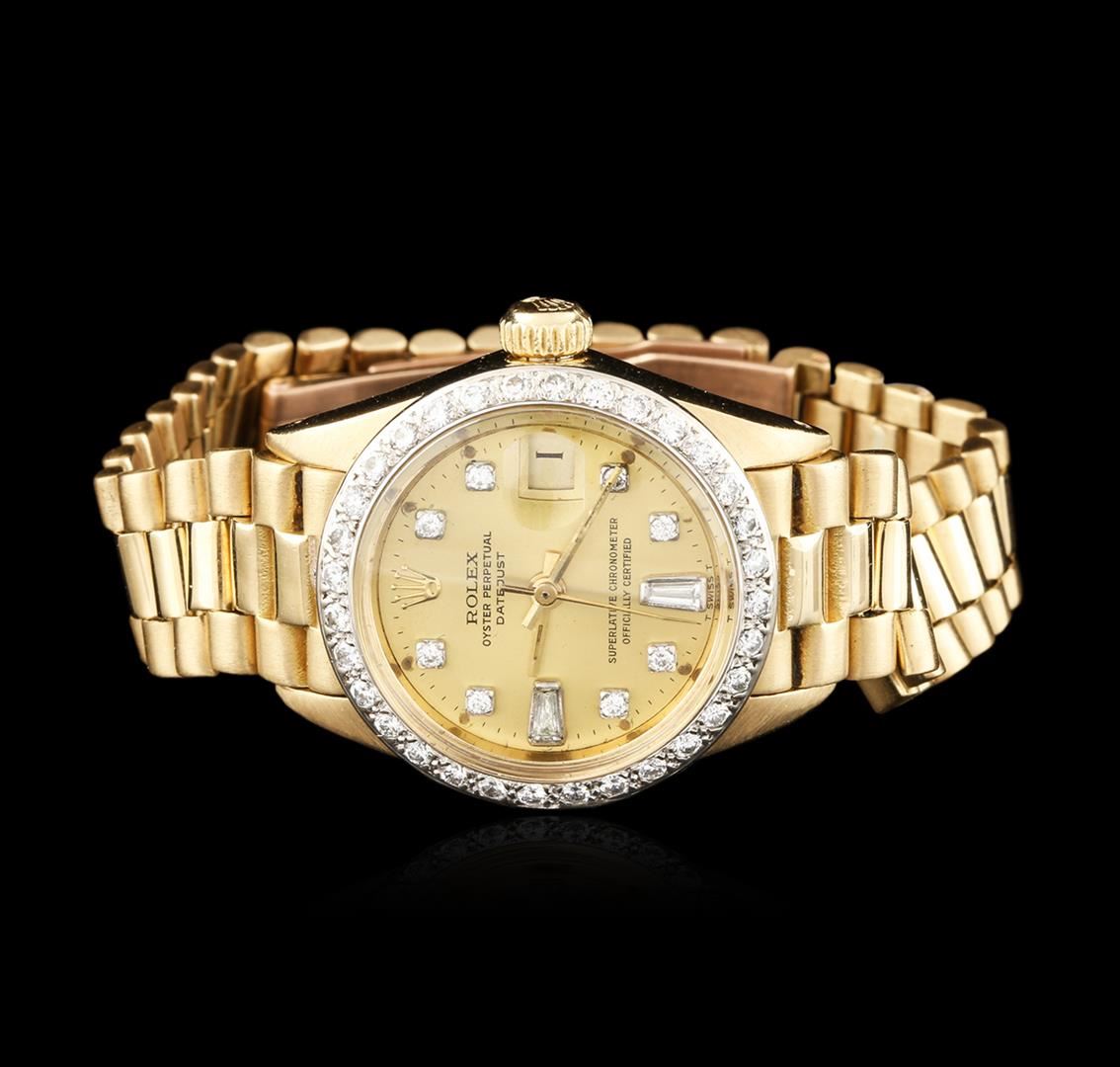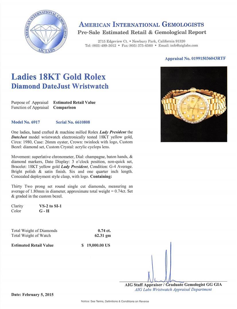 One ladies, hand crafted & machine milled Rolex Lady President the DateJust model wristwatch electronically tested 18KT yellow gold, Circa: 1980, Case: 26mm oyster, Crown: twinlock with logo, Custom Bezel: diamond set, Custom Crystal: acrylic cyclops lens. Movement: superlative chronometer, Dial: champagne, baton hands, & diamond markers, Date Display: 3 o'clock position, non-quick set, Bracelet: 18KT yellow gold Lady President, Condition: G-4 Average. Bright polish & satin finish. Six and one quarter inch length. Concealed deployment style clasp, with logo. Containing: Thirty Two prong set round single cut diamonds, measuring an average of 1.80mm in diameter, approximate total weight = 0.74ct. Set & graded in the custom bezel. Clarity VS-2 to SI-1. Color: G - H. Total Weight of Diamonds 0.74ct. Total Weight of Watch 62.31 grams. AIG Appraised at $19,000.00.