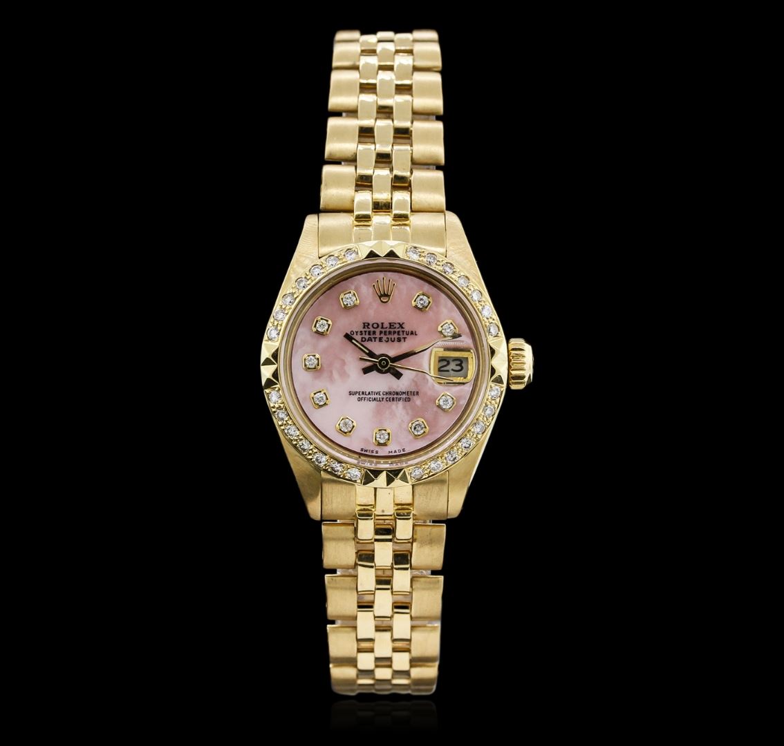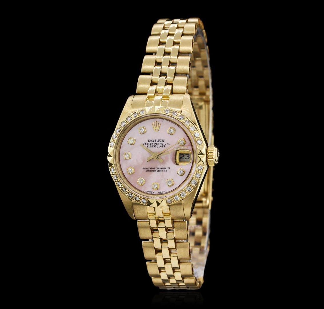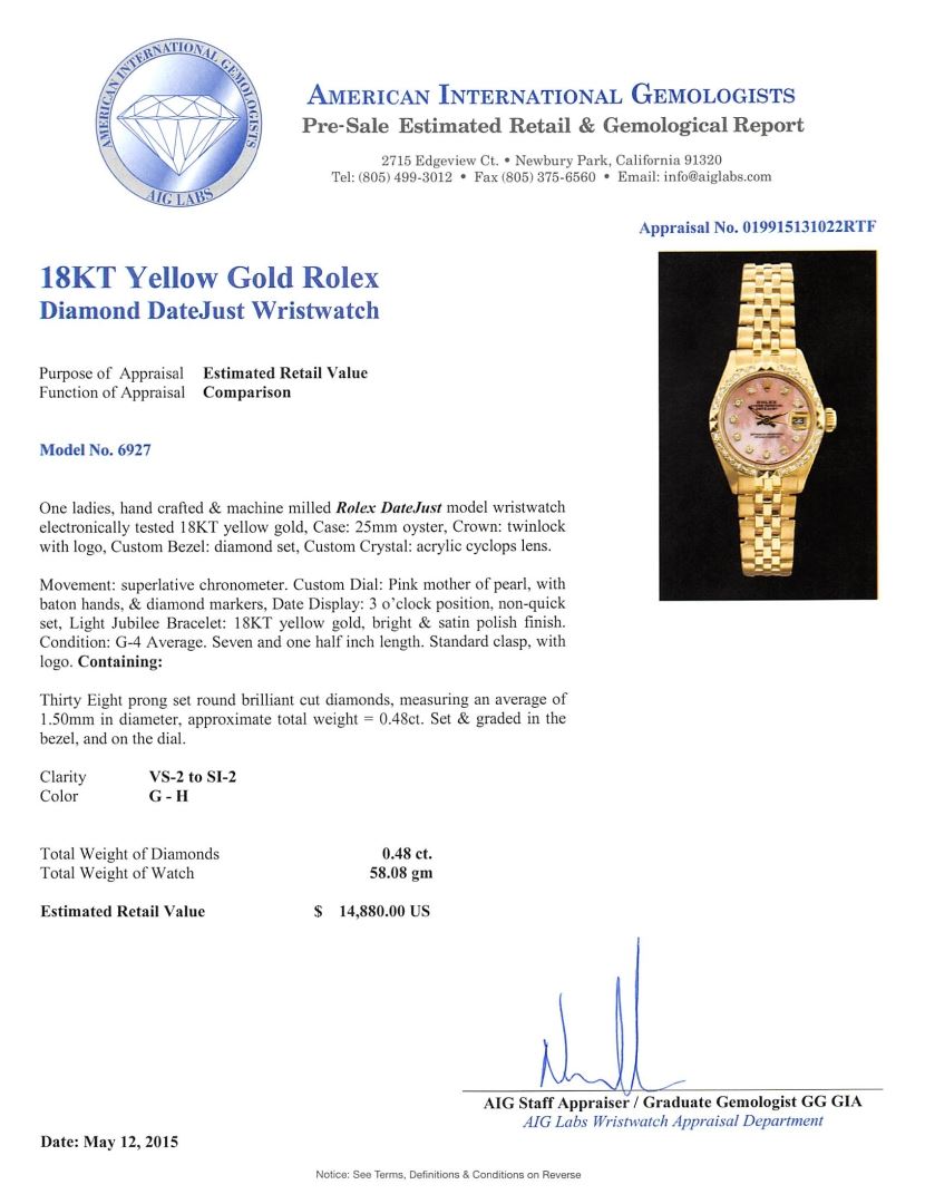 One ladies, hand crafted & machine milled Rolex DateJust model wristwatch electronically tested 18KT yellow gold, Case: 25mm oyster, Crown: twinlock with logo, Custom Bezel: diamond set, Custom Crystal: acrylic cyclops lens. Movement: superlative chronometer. Custom Dial: Pink mother of pearl, with baton hands, & diamond markers, Date Display: 3 o'clock position, non-quick set, Light Jubilee Bracelet: 18KT yellow gold, bright & satin polish finish. Condition: G-4 Average. Seven and one half inch length. Standard clasp, with logo. Containing: Thirty Eight prong set round brilliant cut diamonds, measuring an average of 1.50mm in diameter, approximate total weight = 0.48ct. Set & graded in the bezel, and on the dial. Clarity VS-2 to SI-2. Color: G - H. Total Weight of Diamonds 0.48ct. Total Weight of Watch 58.08gm. AIG Appraised at $14,880.00.