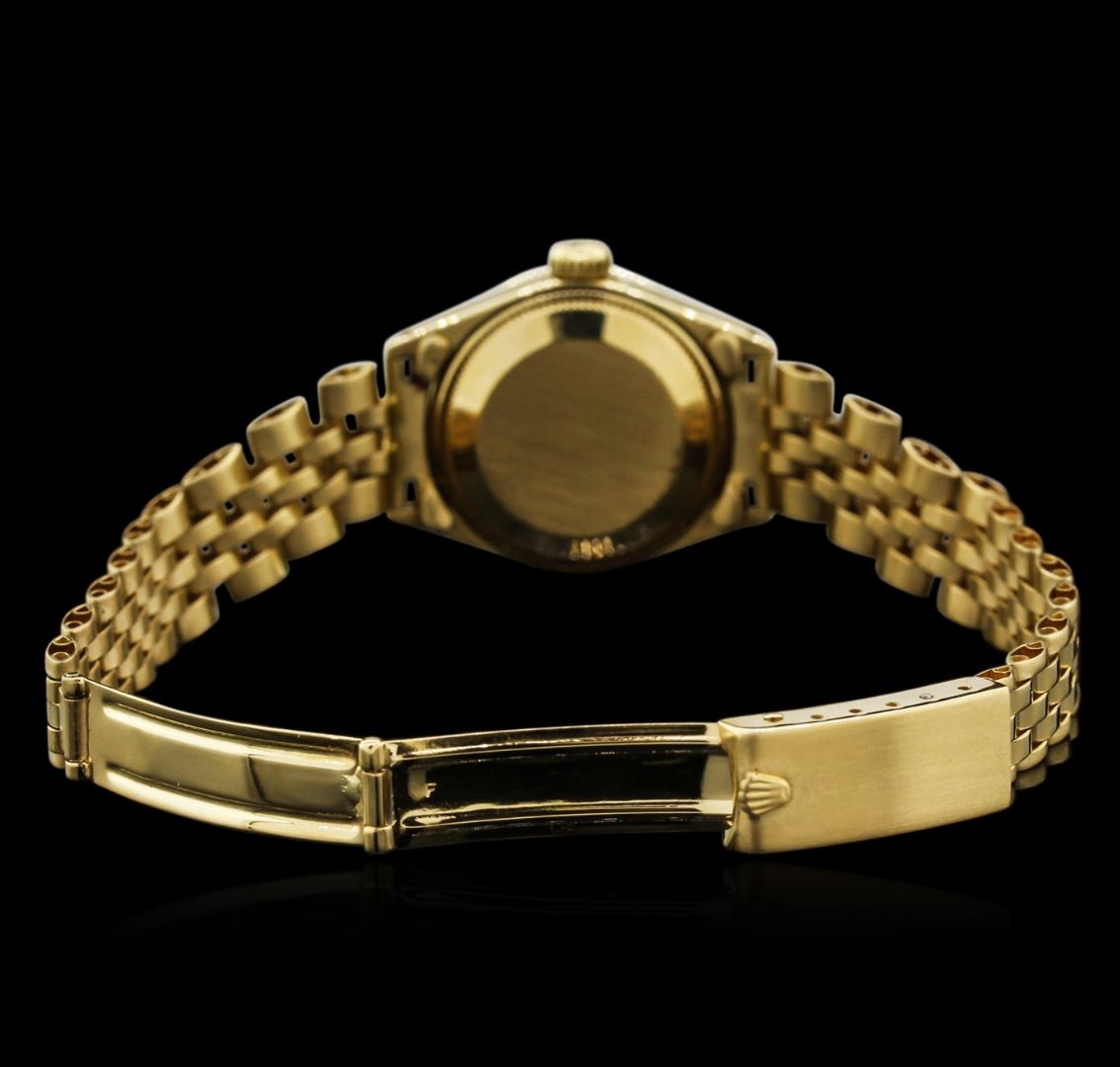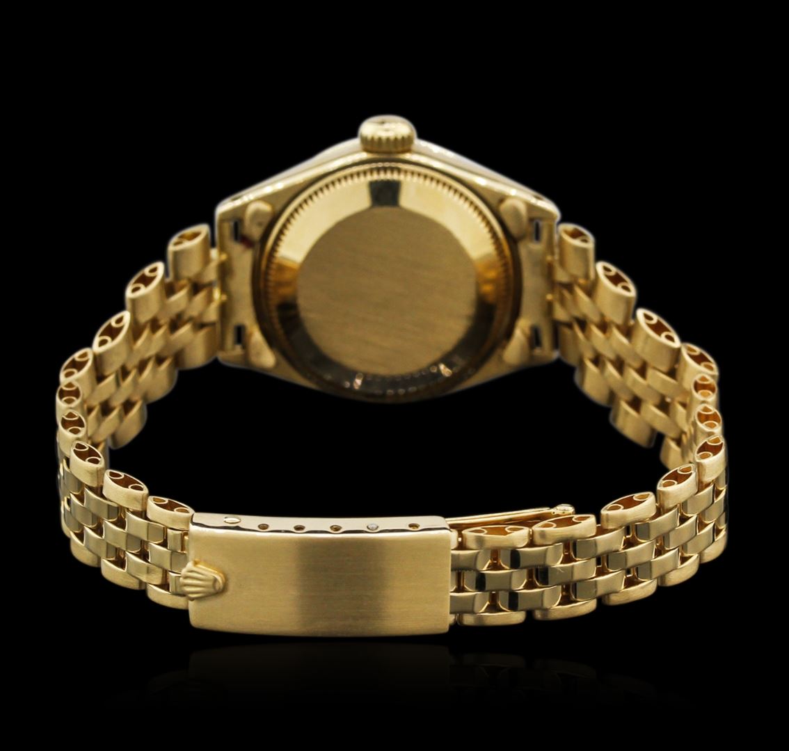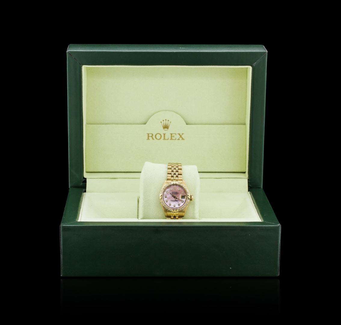 One ladies, hand crafted & machine milled Rolex DateJust model wristwatch electronically tested 18KT yellow gold, Case: 25mm oyster, Crown: twinlock with logo, Custom Bezel: diamond set, Custom Crystal: acrylic cyclops lens. Movement: superlative chronometer. Custom Dial: Pink mother of pearl, with baton hands, & diamond markers, Date Display: 3 o'clock position, non-quick set, Light Jubilee Bracelet: 18KT yellow gold, bright & satin polish finish. Condition: G-4 Average. Seven and one half inch length. Standard clasp, with logo. Containing: Thirty Eight prong set round brilliant cut diamonds, measuring an average of 1.50mm in diameter, approximate total weight = 0.48ct. Set & graded in the bezel, and on the dial. Clarity VS-2 to SI-2. Color: G - H. Total Weight of Diamonds 0.48ct. Total Weight of Watch 58.08gm. AIG Appraised at $14,880.00.