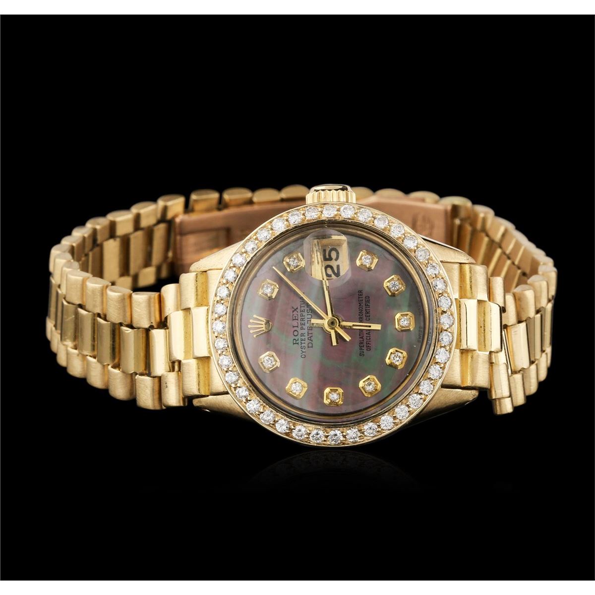One ladies, hand crafted & machine milled Rolex DateJust model wristwatch electronically tested 18KT yellow gold, Circa: 1961, Case: 25mm oyster, Crown: twinlock with logo, Custom Bezel: diamond set, Custom Crystal: acrylic cyclops lens. Movement: superlative chronometer. Custom Dial: dark mother of pearl, with baton hands, & diamond markers, Date Display: 3 o'clock position, non-quick set, Bracelet: 18KT yellow gold, bright and satin finish. Condition: G-4 Average. Six and one half inch length. Concealed deployment clasp, with logo. Containing: Forty prong set round brilliant cut diamonds, measuring an average of 1.55mm in diameter, approximate total weight = 0.44ct. Set & graded in the bezel Clarity SI-1 to SI-2 Average. Color: G - H. Total Weight of Diamonds 0.44ct. Total Weight of Watch 60.00 grams. AIG Appraised at $17,050.00.