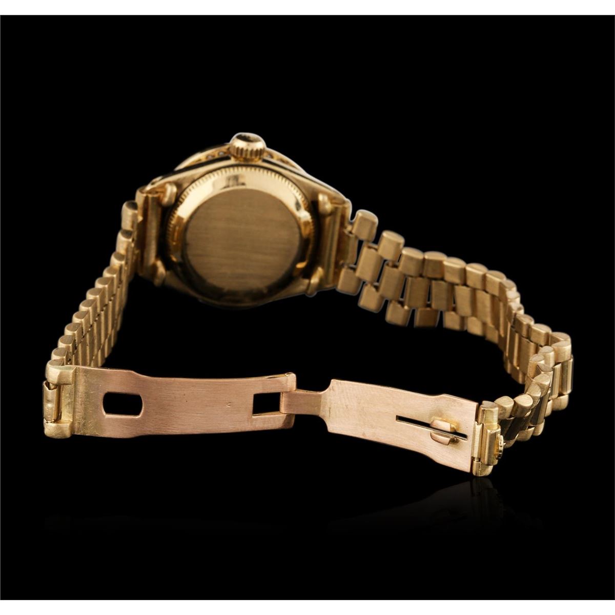One ladies, hand crafted & machine milled Rolex DateJust model wristwatch electronically tested 18KT yellow gold, Circa: 1961, Case: 25mm oyster, Crown: twinlock with logo, Custom Bezel: diamond set, Custom Crystal: acrylic cyclops lens. Movement: superlative chronometer. Custom Dial: dark mother of pearl, with baton hands, & diamond markers, Date Display: 3 o'clock position, non-quick set, Bracelet: 18KT yellow gold, bright and satin finish. Condition: G-4 Average. Six and one half inch length. Concealed deployment clasp, with logo. Containing: Forty prong set round brilliant cut diamonds, measuring an average of 1.55mm in diameter, approximate total weight = 0.44ct. Set & graded in the bezel Clarity SI-1 to SI-2 Average. Color: G - H. Total Weight of Diamonds 0.44ct. Total Weight of Watch 60.00 grams. AIG Appraised at $17,050.00.