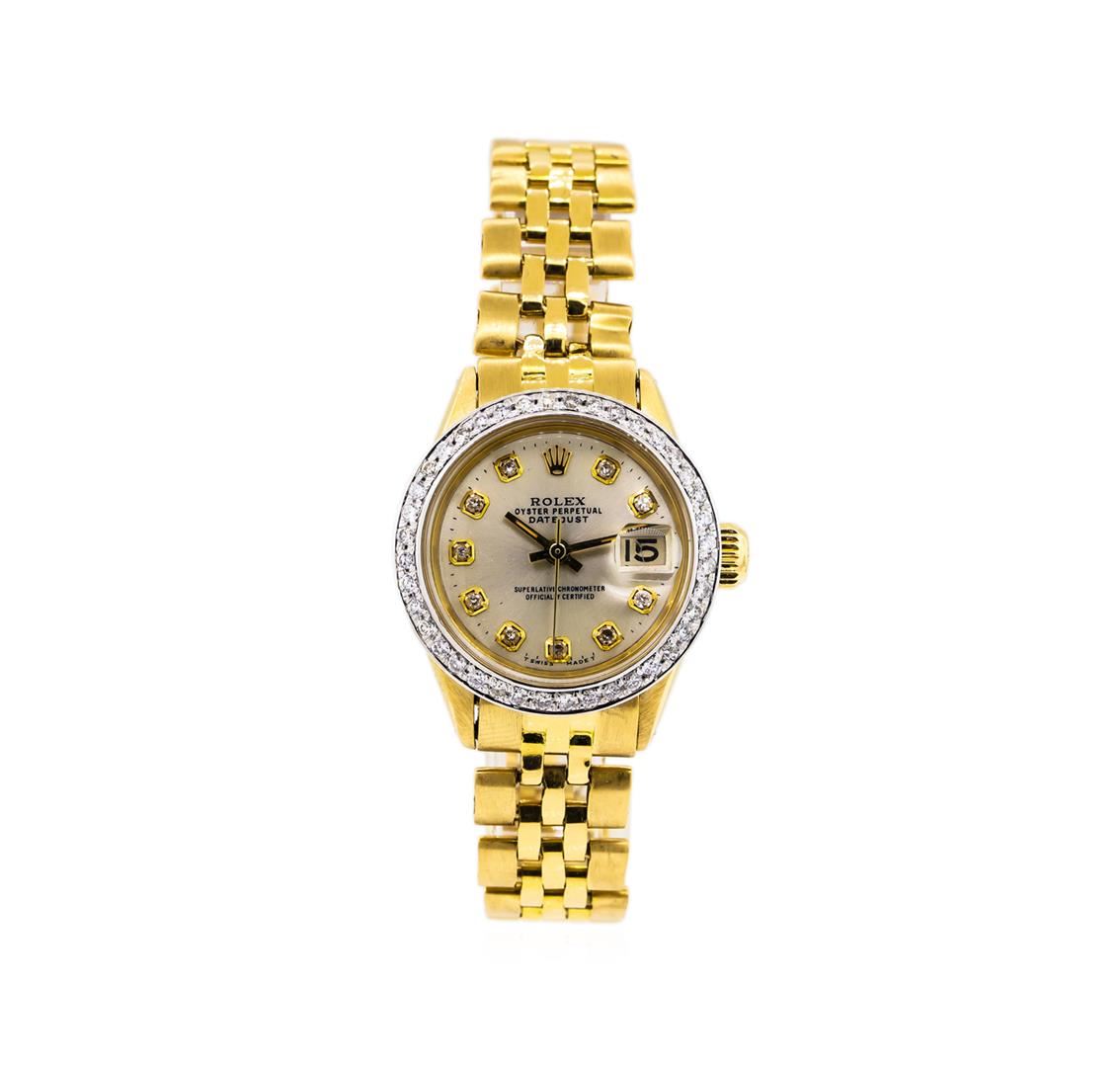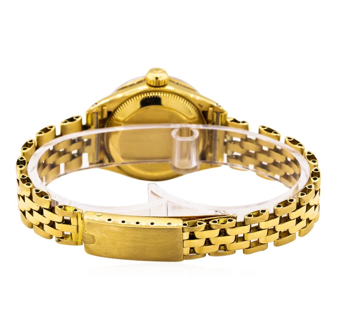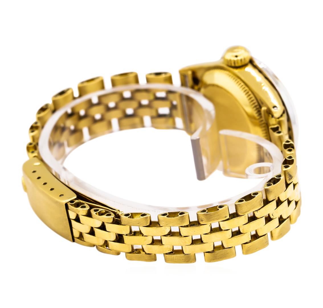 One ladies, hand crafted & machine milled Rolex DateJust model wristwatch electronically tested 18KT yellow gold, Swiss Hallmarked Case: 25mm oyster, Crown: twinlock with logo, non-factory Custom Bezel: fluted, Crystal: acrylic cyclops lens. Movement: superlative chronometer, Customized Rolex signed Dial: mother of pearl, with baton hands, and diamond markers, Date Display: Light Ivory color date wheel, 3 o'clock position, non-quick set. Bracelet: 18KT yellow gold, the light jubilee link, Condition: G-5 Fine. Circa: 1966, Bright polish & satin finish. Six inch length. Swiss and Rolex Hallmarked clasp, with logo. Containing: Forty prong set round brilliant cut diamonds, measuring an average of 1.50mm in diameter, approximate total weight = 0.50ct Set & graded in the bezel. Clarity VS-1 to SI-1 Average. Color: F - H. Total Weight of Diamonds 0.50ct. Total Weight of Watch 49.26gm. AIG Appraised at $18,440.00.