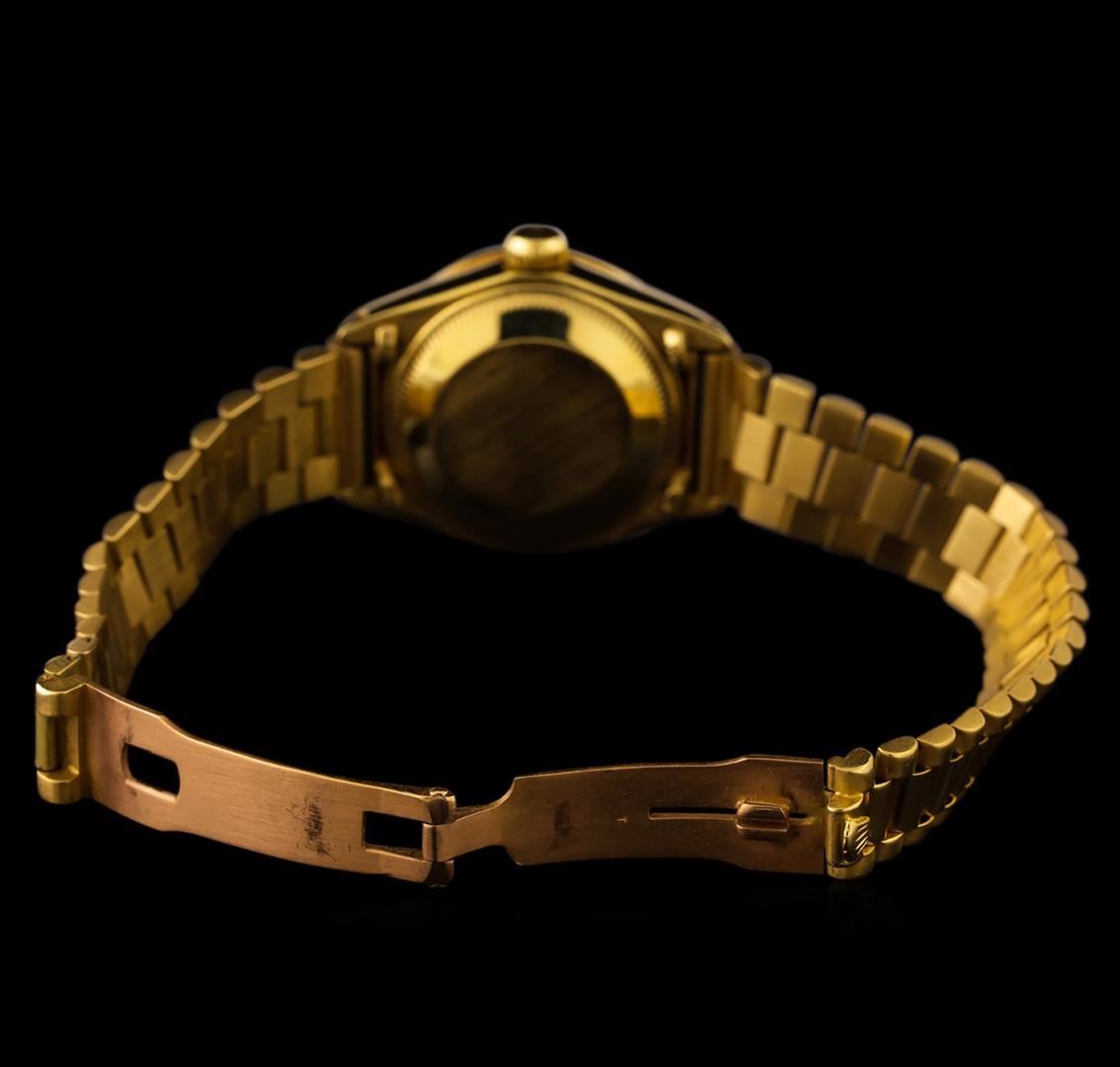 One ladies, hand crafted & machine milled Rolex DateJust model wristwatch electronically tested 18KT yellow gold, Circa: 1979, Swiss Hallmarked Case: 26mm oyster, Rolex Signature Crown: twinlock with Rolex logo, Custom Bezel: diamond set, Custom Crystal: synthetic sapphire cyclops lens. Movement: superlative chronometer, Custom Dial: mother of pearl, baton hands, & diamond markers, Date Display: 3 o'clock position, non-quick set, Rolex Bracelet: 18KT yellow gold, Condition: G-5 Fine. Six and one half inch length. Three removable links. Swiss & Rolex Hallmarked clasp, with logo. Containing: Thirty Three prong set round brilliant cut diamonds, measuring an average of 1.80mm in diameter, approximate total weight = 0.80ct. Set & graded in the custom bezel. Clarity VS-1 to VS-2 Average Color G - H. Total Weight of Diamonds 0.80ct. Total Weight of Watch 65.84gm. AIG Appraised at $20,050.00.