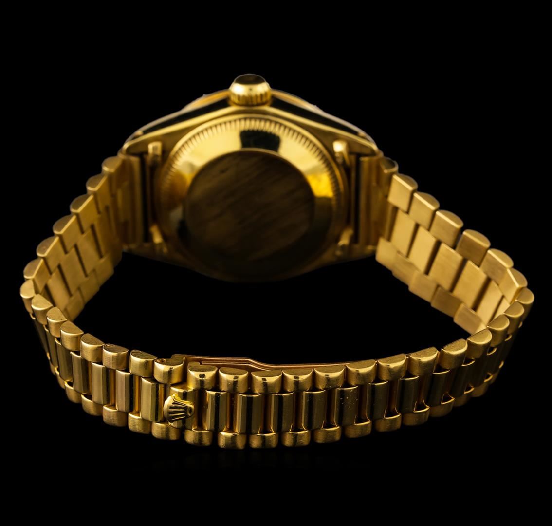 One ladies, hand crafted & machine milled Rolex DateJust model wristwatch electronically tested 18KT yellow gold, Circa: 1979, Swiss Hallmarked Case: 26mm oyster, Rolex Signature Crown: twinlock with Rolex logo, Custom Bezel: diamond set, Custom Crystal: synthetic sapphire cyclops lens. Movement: superlative chronometer, Custom Dial: mother of pearl, baton hands, & diamond markers, Date Display: 3 o'clock position, non-quick set, Rolex Bracelet: 18KT yellow gold, Condition: G-5 Fine. Six and one half inch length. Three removable links. Swiss & Rolex Hallmarked clasp, with logo. Containing: Thirty Three prong set round brilliant cut diamonds, measuring an average of 1.80mm in diameter, approximate total weight = 0.80ct. Set & graded in the custom bezel. Clarity VS-1 to VS-2 Average Color G - H. Total Weight of Diamonds 0.80ct. Total Weight of Watch 65.84gm. AIG Appraised at $20,050.00.