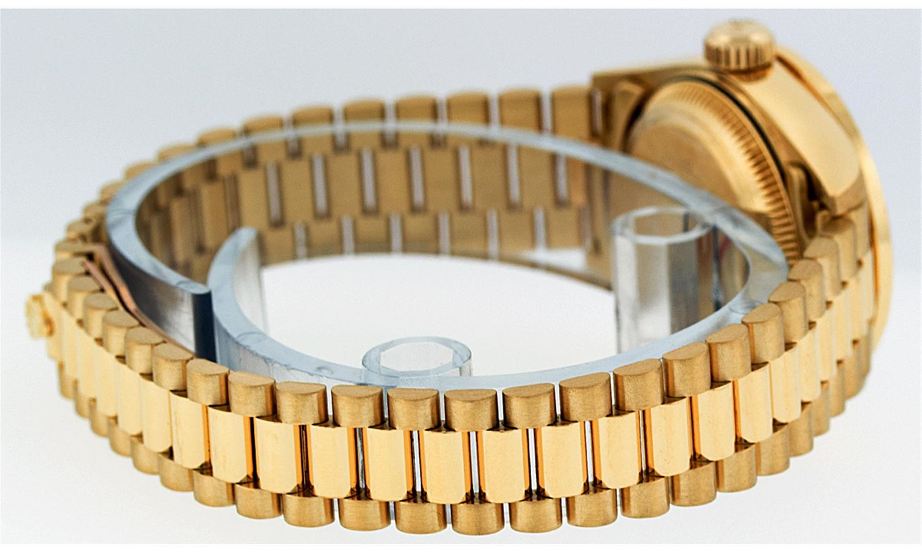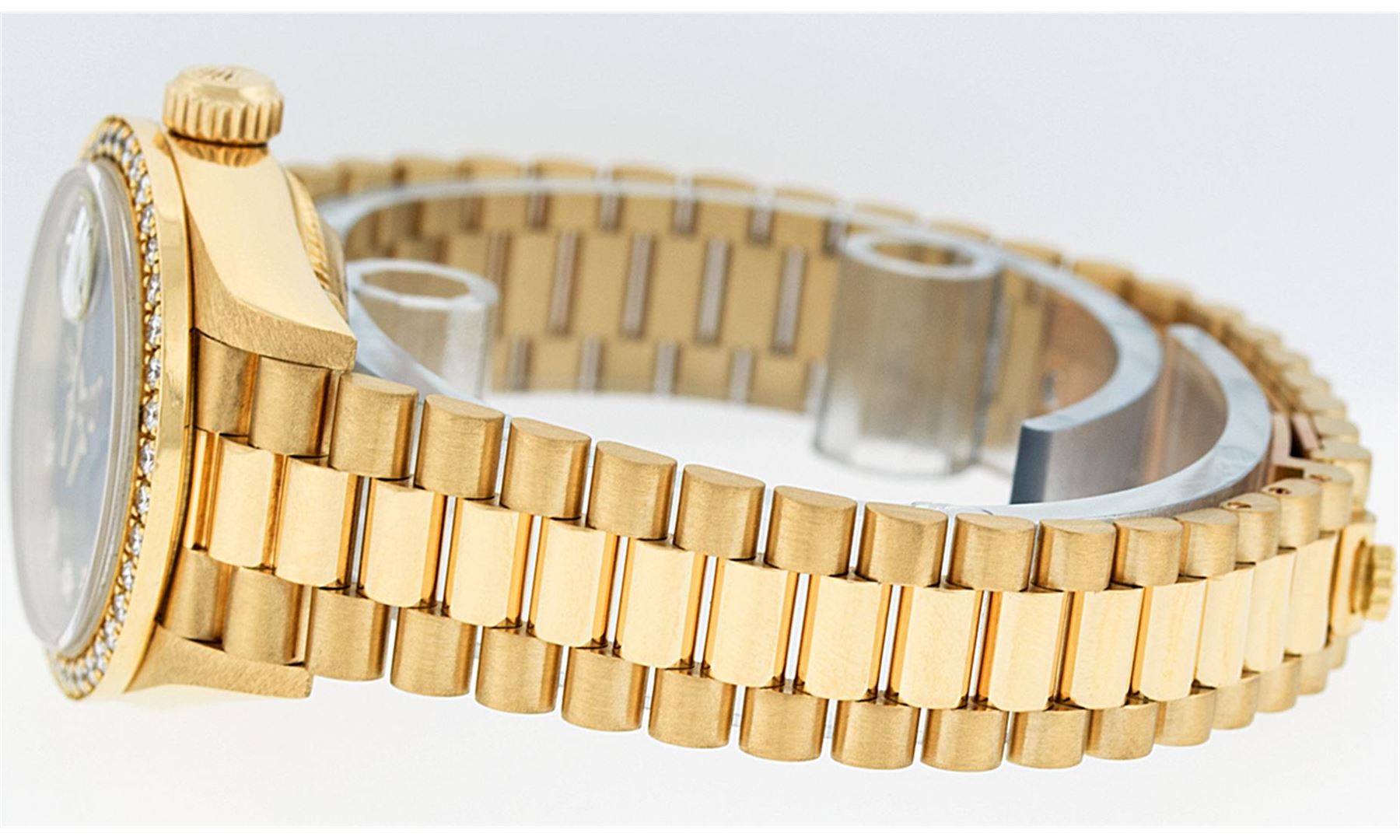 One Ladies 18K Rolex President Polished, Serviced & Electronically Tested, Yellow Gold Case: 26mm, 18K Yellow Gold Crown, Custom Bezel: 18K Yellow Gold Beadset Diamond Bezel, Diamond Count: 32 Diamonds. Total Weight .70 Carat, Clarity: SI-VS, Color: G to H. Custom Crystal: Synthetic Sapphire Cyclops Lens. Movement: Automatic Winding Movement Caliber 2030. Custom Dial: Blue Vignette Diamond With Lumi Dots And Line Track, Stone Count: 10 Diamonds In Dial. Color: G to H, Clarity: VVS. Date Window: 3 O'Clock Position, Model: Datejust, Quickset, Condition: G-6 Extra Fine. Bracelet: 18K Yellow Gold President With Hidden Clasp, Bright & Satin Polish. 6.0 Inch Length, Standard President Clasp (Hidden Clasp), With Rolex Logo.