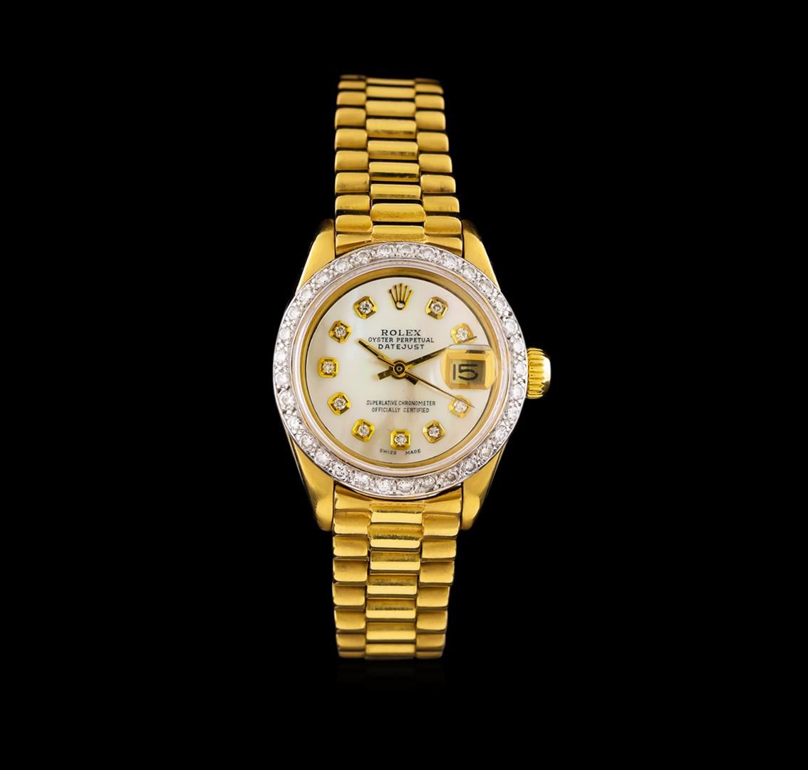 One ladies, hand crafted & machine milled Rolex DateJust model wristwatch electronically tested 18KT yellow gold, Circa: 1979, Swiss Hallmarked Case: 26mm oyster, Rolex Signature Crown: twinlock with Rolex logo, Custom Bezel: diamond set, Custom Crystal: synthetic sapphire cyclops lens. Movement: superlative chronometer, Custom Dial: mother of pearl, baton hands, & diamond markers, Date Display: 3 o'clock position, non-quick set, Rolex Bracelet: 18KT yellow gold, Condition: G-5 Fine. Six and one half inch length. Three removable links. Swiss & Rolex Hallmarked clasp, with logo. Containing: Thirty Three prong set round brilliant cut diamonds, measuring an average of 1.80mm in diameter, approximate total weight = 0.80ct. Set & graded in the custom bezel. Clarity VS-1 to VS-2 Average Color G - H. Total Weight of Diamonds 0.80ct. Total Weight of Watch 65.84gm. AIG Appraised at $20,050.00.