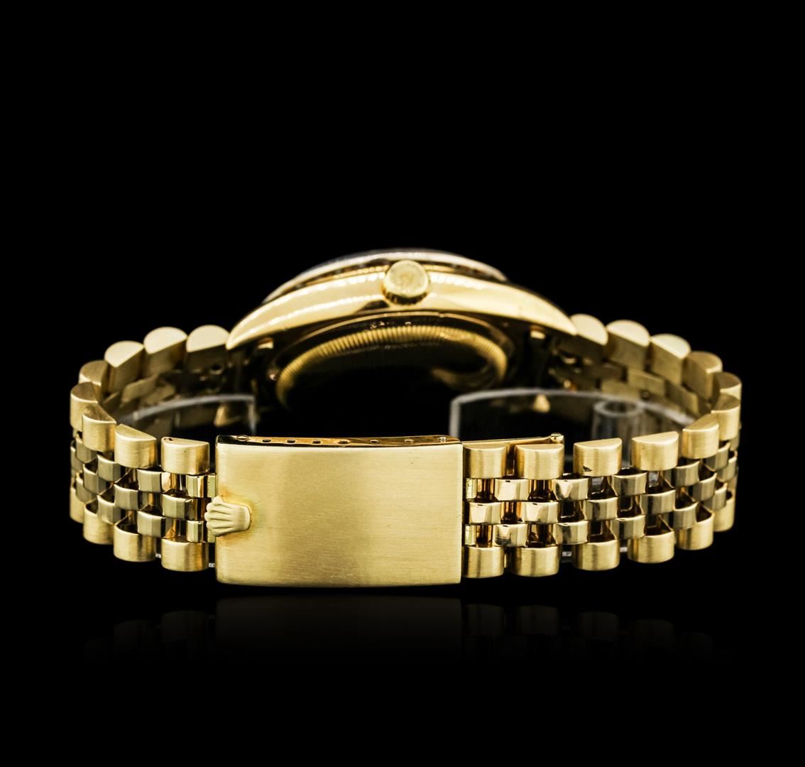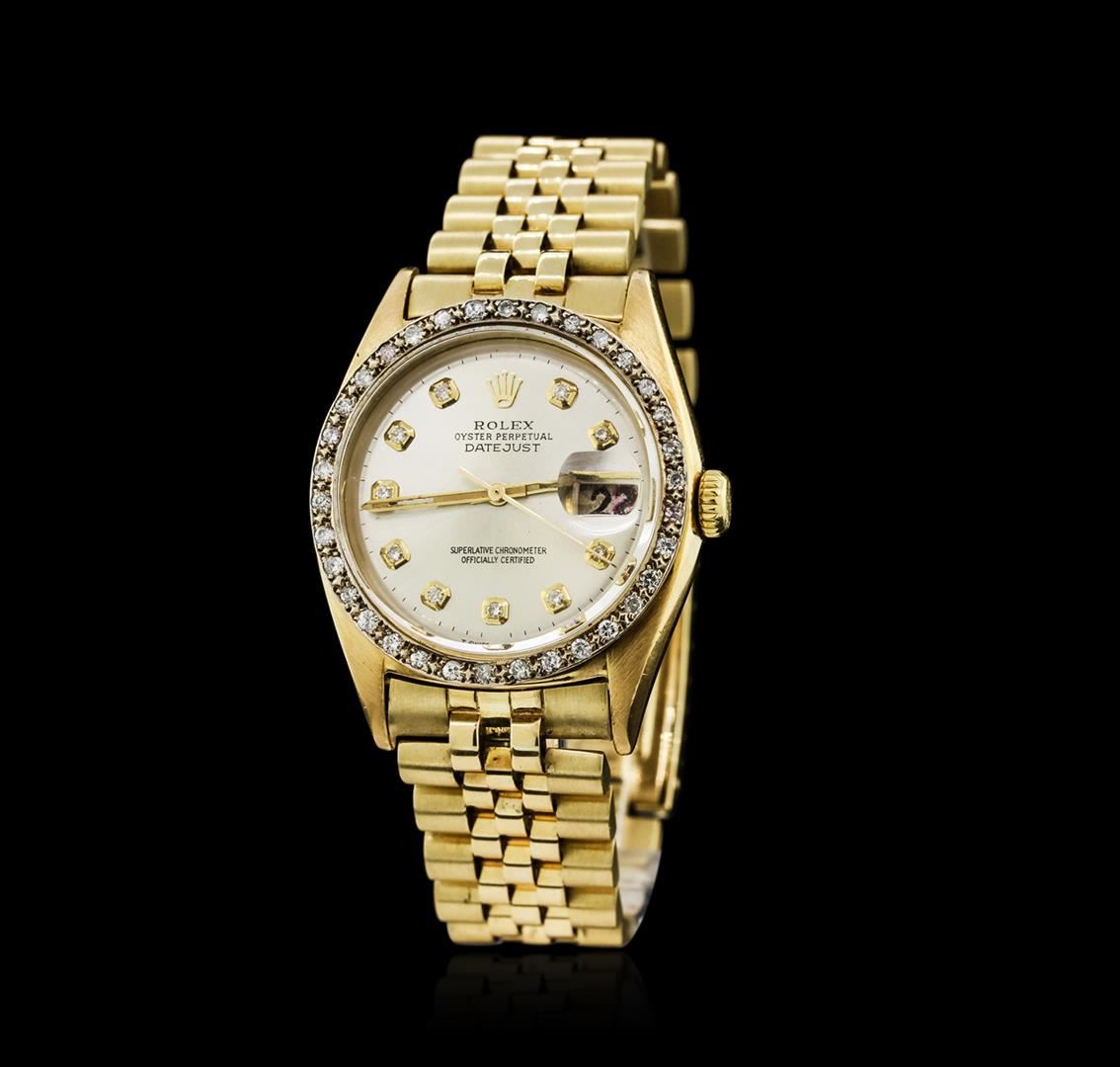 One gents, hand crafted & machine milled Rolex DateJust Model wristwatch electronically tested. 18KT yellow gold, Case: 35mm oyster, 18KT yellow gold Crown: twin lock with logo, Custom Bezel: diamond set, Crystal: acrylic cyclops lens. Movement: superlative chronometer, Custom Dial: Silvered, with baton hands & diamond markers, Date Window: 3 o'clock position non-quick set, Custom Date Wheel: Red numerals, Bracelet: 14KT yellow gold, bright & satin finish, Condition: G-4 Average. Seven and one half inch length. Standard clasp, with logo. Containing: Thirty Four prong set round brilliant cut diamonds, approximate total weight equals 0.80ct. Set & graded in the bezel. Clarity I-1 to I-2. Color G - I. Total Weight of Diamonds 0.80ct. Total Weight of Watch 107.03 grams. AIG appraised at $14,000.00. AIG Appraised at $14,000.00.