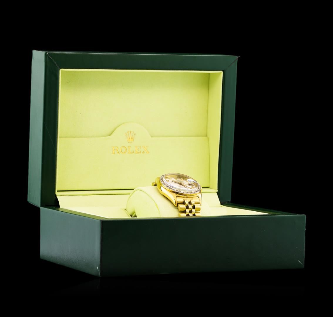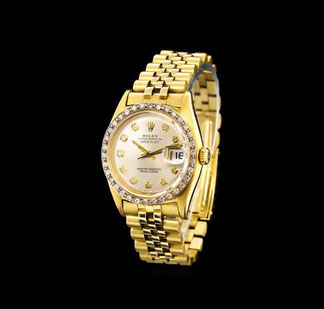 One gents, hand crafted & machine milled Rolex DateJust Model wristwatch electronically tested. 18KT yellow gold, Case: 35mm oyster, 18KT yellow gold Crown: twin lock with logo, Custom Bezel: diamond set, Crystal: acrylic cyclops lens. Movement: superlative chronometer, Custom Dial: Silvered, with baton hands & diamond markers, Date Window: 3 o'clock position non-quick set, Custom Date Wheel: Red numerals, Bracelet: 14KT yellow gold, bright & satin finish, Condition: G-4 Average. Seven and one half inch length. Standard clasp, with logo. Containing: Thirty Four prong set round brilliant cut diamonds, approximate total weight equals 0.80ct. Set & graded in the bezel. Clarity I-1 to I-2. Color G - I. Total Weight of Diamonds 0.80ct. Total Weight of Watch 107.03 grams. AIG Appraised at $14,000.00.