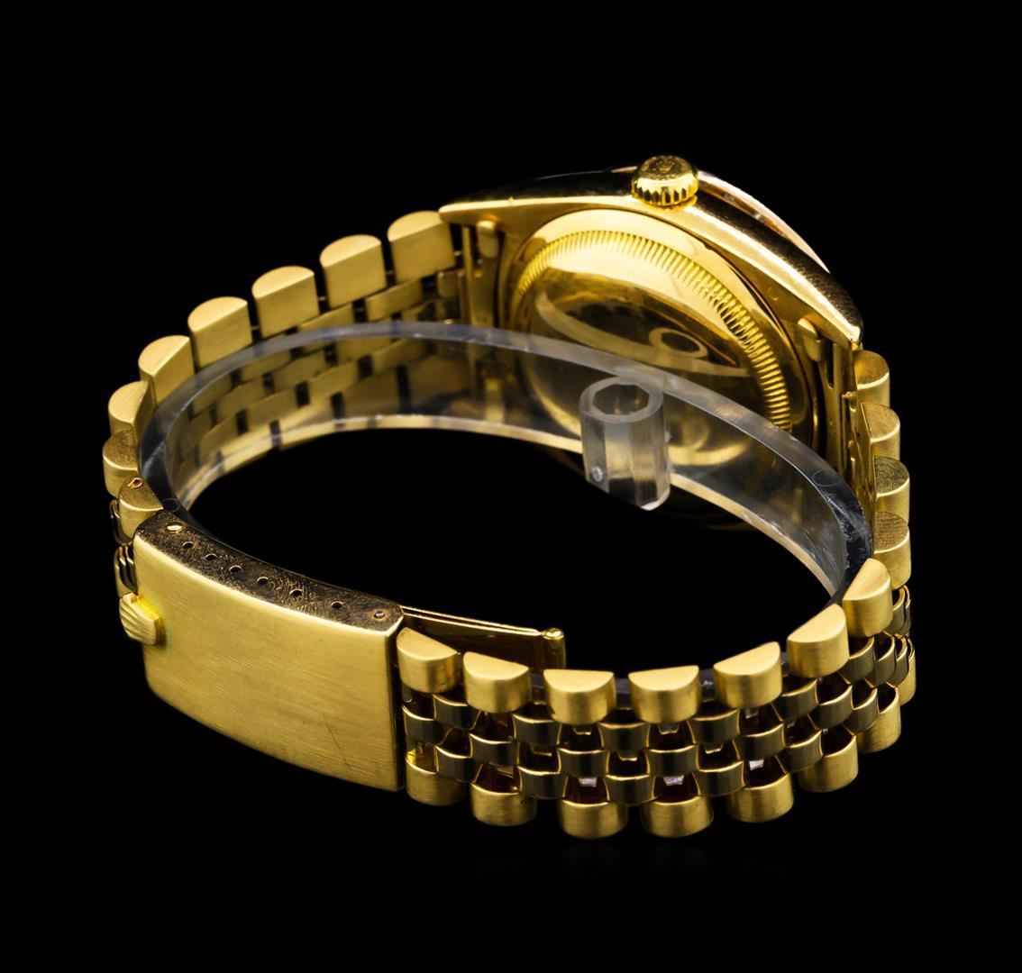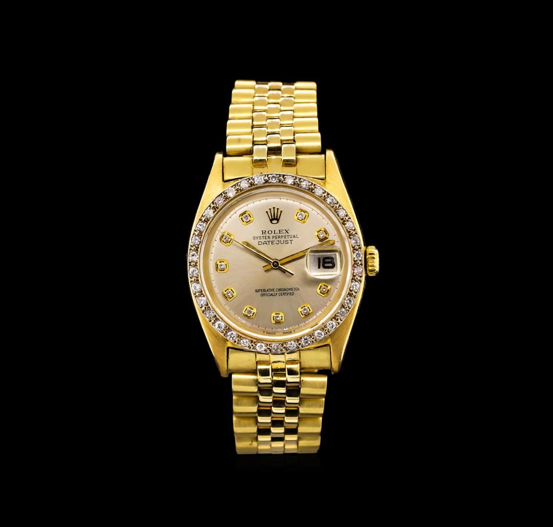 One gents, hand crafted & machine milled Rolex DateJust Model wristwatch electronically tested. 18KT yellow gold, Case: 35mm oyster, 18KT yellow gold Crown: twin lock with logo, Custom Bezel: diamond set, Crystal: acrylic cyclops lens. Movement: superlative chronometer, Custom Dial: Silvered, with baton hands & diamond markers, Date Window: 3 o'clock position non-quick set, Custom Date Wheel: Red numerals, Bracelet: 14KT yellow gold, bright & satin finish, Condition: G-4 Average. Seven and one half inch length. Standard clasp, with logo. Containing: Thirty Four prong set round brilliant cut diamonds, approximate total weight equals 0.80ct. Set & graded in the bezel. Clarity I-1 to I-2. Color G - I. Total Weight of Diamonds 0.80ct. Total Weight of Watch 107.03 grams. AIG Appraised at $14,000.00.