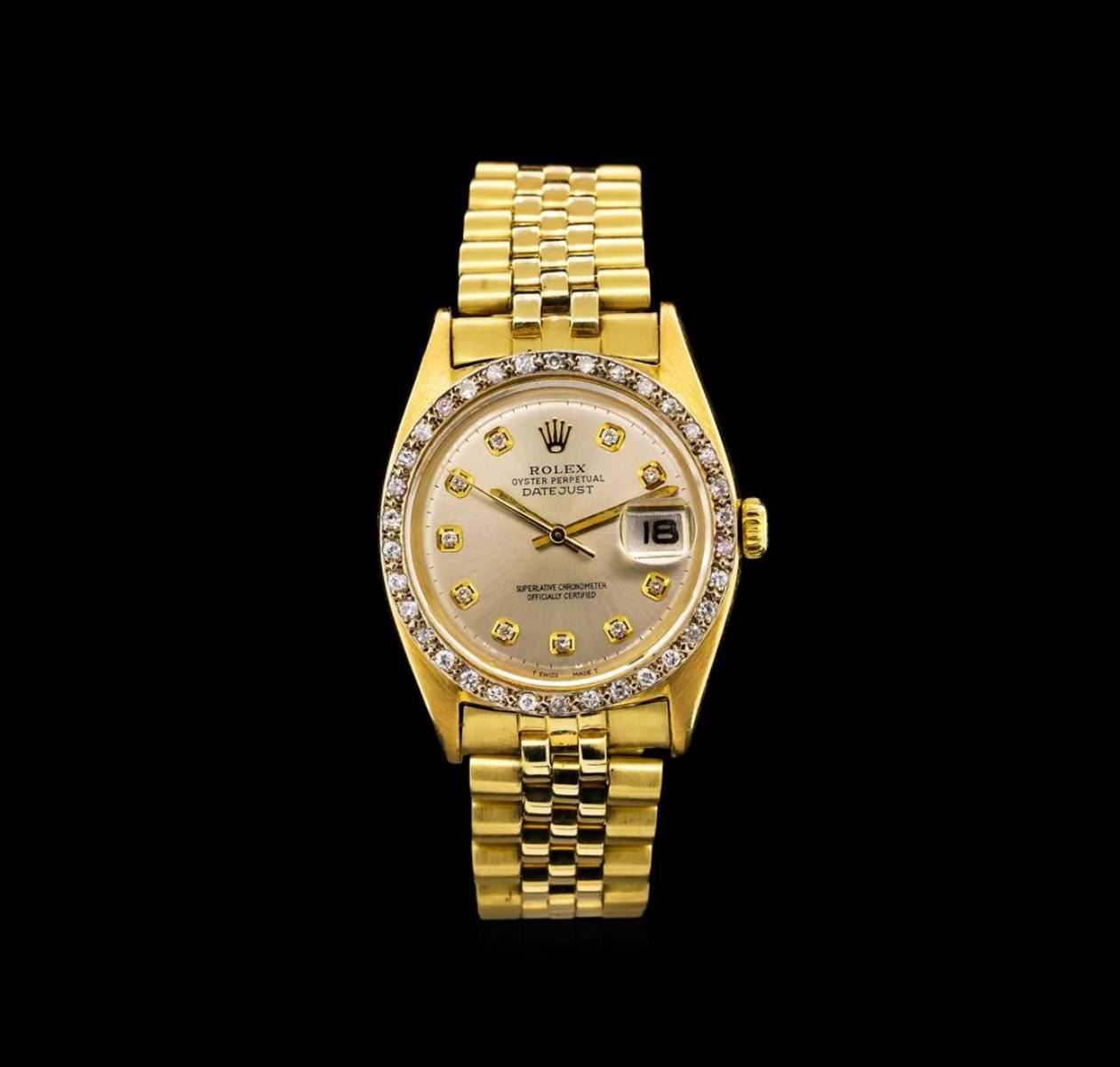 One gents, hand crafted & machine milled Rolex DateJust Model wristwatch electronically tested. 18KT yellow gold, Case: 35mm oyster, 18KT yellow gold Crown: twin lock with logo, Custom Bezel: diamond set, Crystal: acrylic cyclops lens. Movement: superlative chronometer, Custom Dial: Silvered, with baton hands & diamond markers, Date Window: 3 o'clock position non-quick set, Custom Date Wheel: Red numerals, Bracelet: 14KT yellow gold, bright & satin finish, Condition: G-4 Average. Seven and one half inch length. Standard clasp, with logo. Containing: Thirty Four prong set round brilliant cut diamonds, approximate total weight equals 0.80ct. Set & graded in the bezel. Clarity I-1 to I-2. Color G - I. Total Weight of Diamonds 0.80ct. Total Weight of Watch 107.03 grams. AIG Appraised.