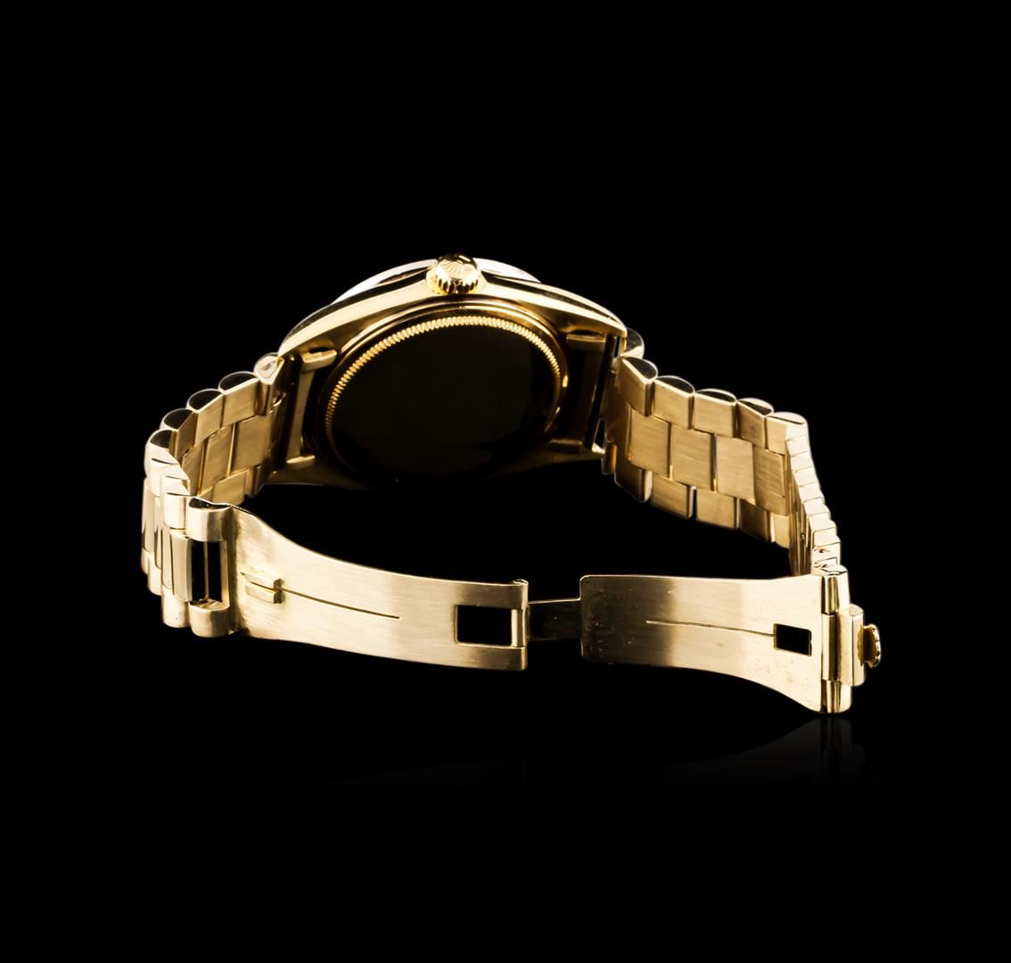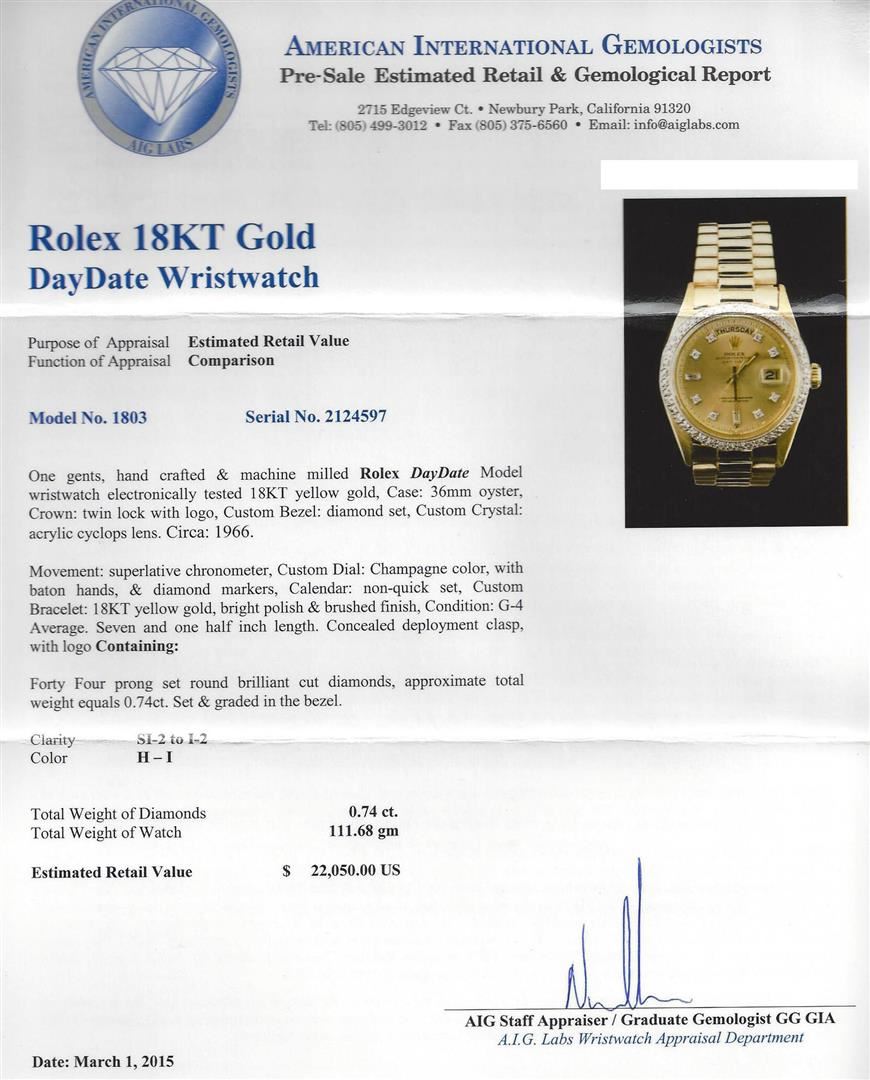 One gents, hand crafted & machine milled Rolex DayDate Model wristwatch electronically tested 18KT yellow gold, Case: 36mm oyster, Crown: twin lock with logo, Custom Bezel: diamond set, Custom Crystal: acrylic cyclops lens. Circa: 1966.Movement: superlative chronometer, Custom Dial: Champagne color, with baton hands, & diamond markers, Calendar: non-quick set, Custom Bracelet: 18KT yellow gold, bright polish & brushed finish, Condition: G-4 Average. Seven and one half inch length. Concealed deployment clasp, with logo Containing: Forty Four prong set round brilliant cut diamonds, approximate total weight equals 0.74ct. Set & graded in the bezel. Clarity: SI-2 to I-2. Color: H - I. Total Weight of Diamonds 0.74ct. Total Weight of Watch 111.68gm. AIG Appraised at $22,050.00.