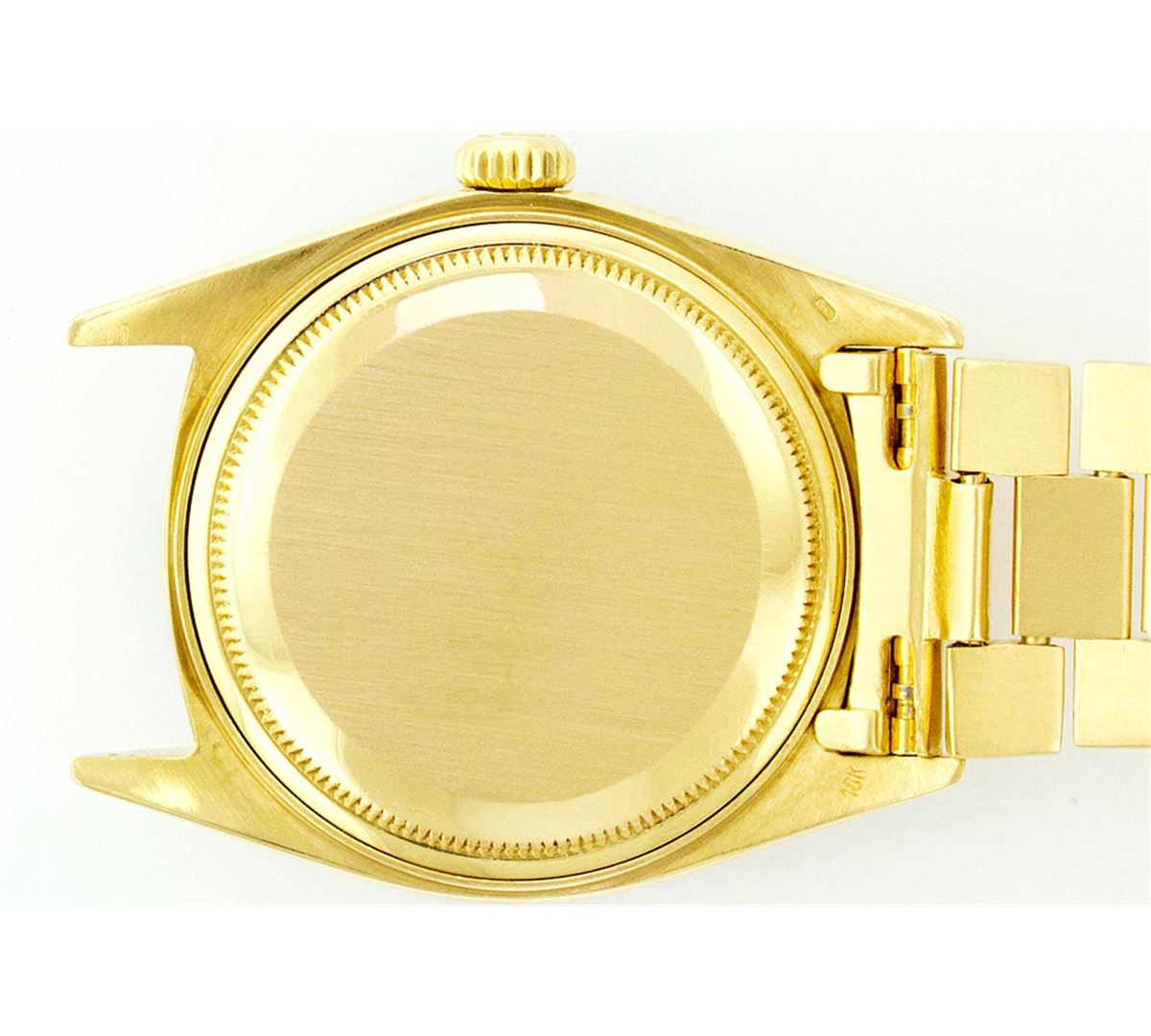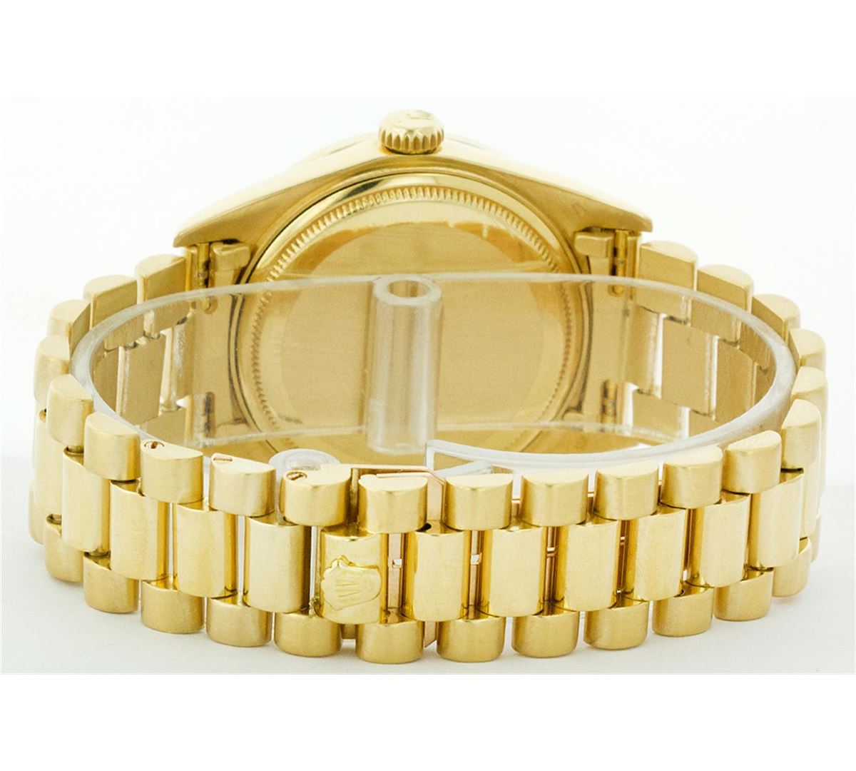 One Gents Rolex President Polished, Serviced & Electronically Tested, Yellow Gold Case:36mm, Yellow Gold Crown, Diamond Lugs: 24 Diamonds In Lugs, Clarity SI-VS, Color: G to H Custom Bezel: 18K Yellow Gold Sapphire Beadset Diamond Bezel, Diamond + Gem Count: 36 Diamonds + 4 Sapphires Total Weight 1.00 Carat, Clarity: SI-VS, Color: G to H. Custom Crystal: Synthetic Sapphire Cyclops Lens. Movement: Automatic Winding Movement Caliber 3155. Custom Dial: Blue Vignette With Diamond Hour Markers, (8 Diamond In Dial + 2 Baguette Diamonds In Dial) G To H In Color, Clarity: SI-VS. Date Window: 3 O'Clock Position Date Display, Quickset, Model: 18038 Condition: G-6 Extra Fine. Bracelet: Yellow Gold President. Bright Polish. 6.5 Inch Length, Standard President Clasp, With Rolex Logo.