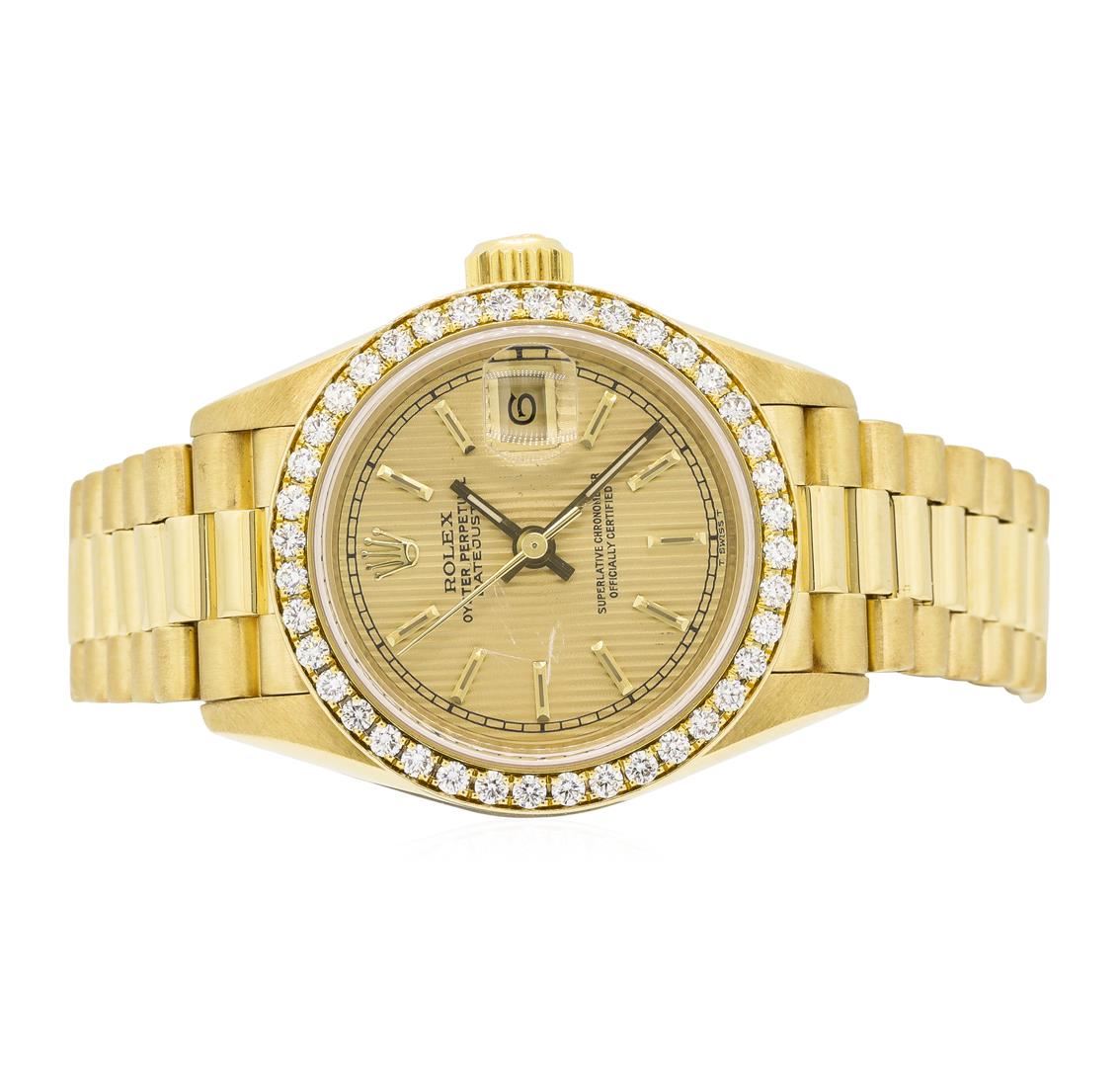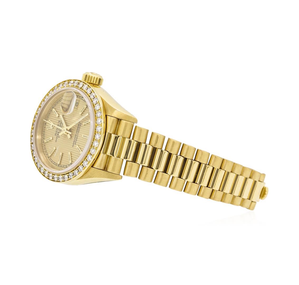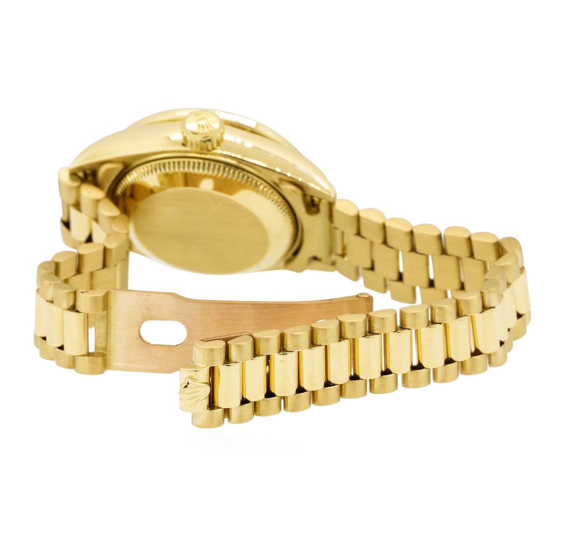 One 18KT yellow gold Rolex ladie's Oyster Perpetual Datejust with a case measuring 26 millimeters with a Rolex diamond bezel, gold dial with stick markers and minute track in black. The case is connected to a two-tone Rolex presidential bracelet with a de