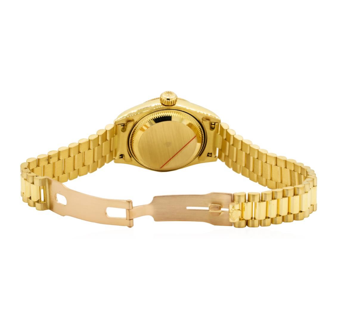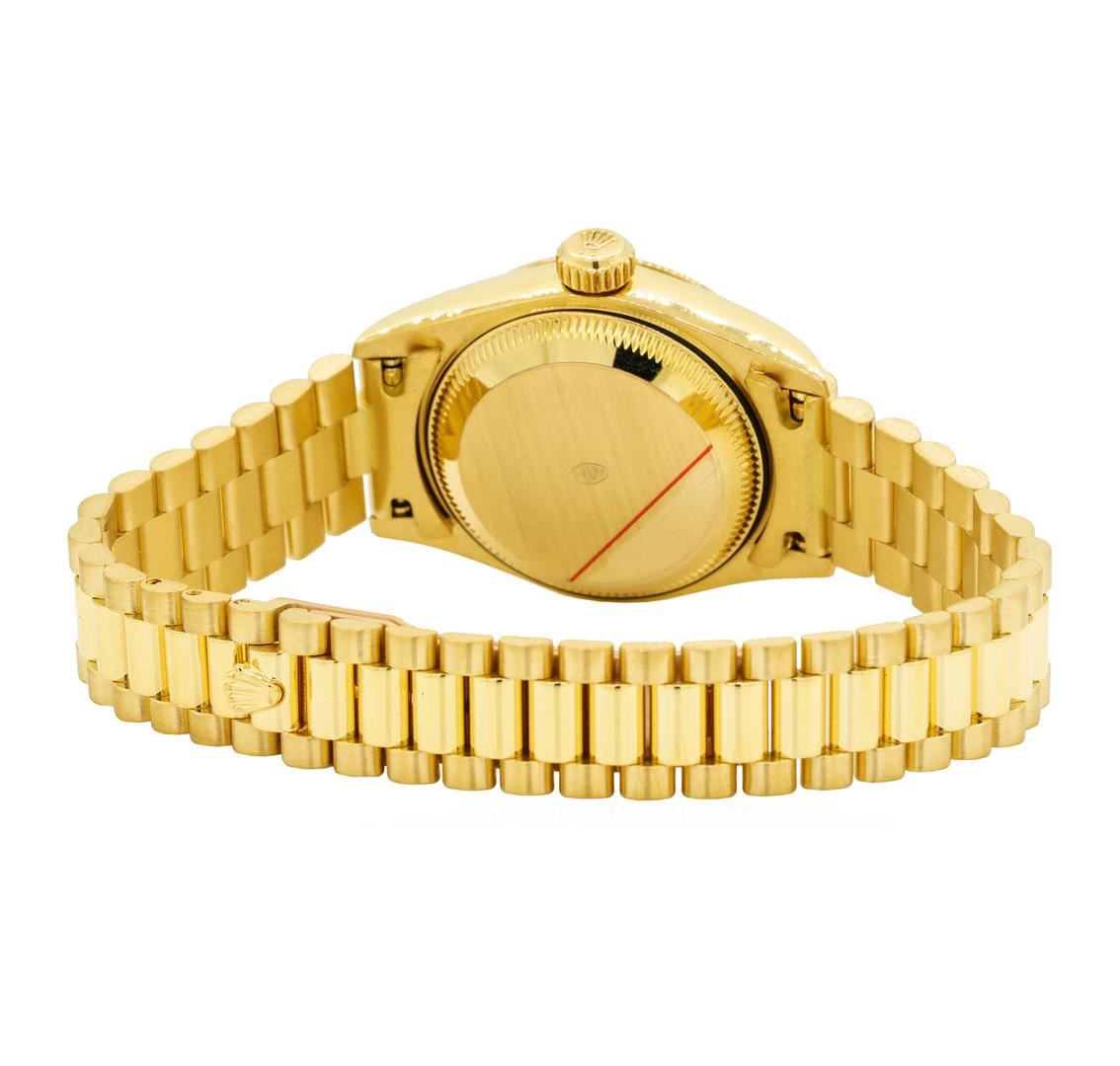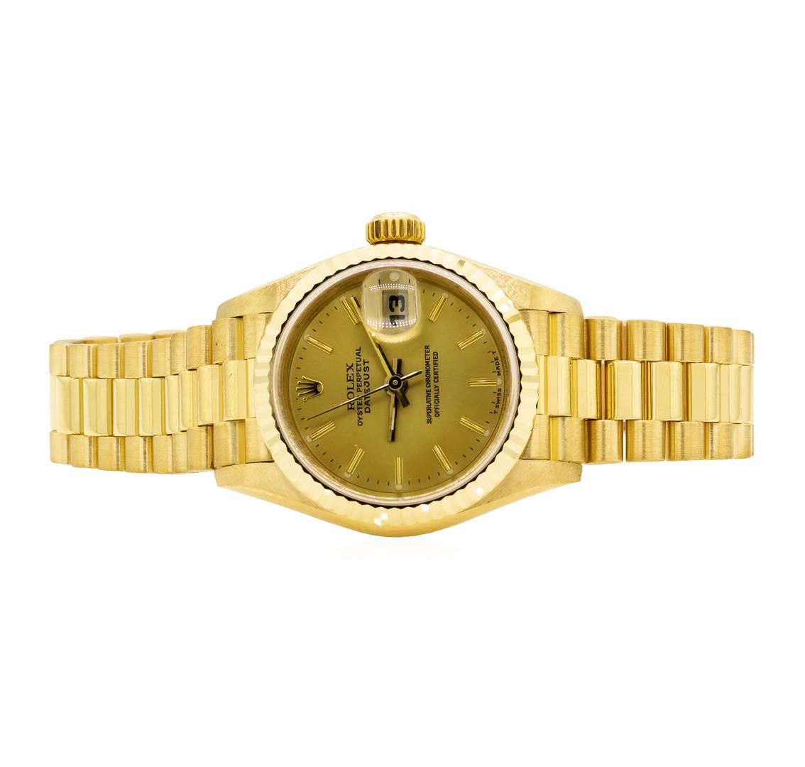 One Rolex President women's watch featuring: Case: 18KT yellow gold. Bezel: 18KT yellow gold. Crystal: Acrylic. Crown: Screw-down. Dial: Gold color; gold tone hour markers. Features: date window located at the 3 o'clock position. Bracelet: 18KT yellow gold.