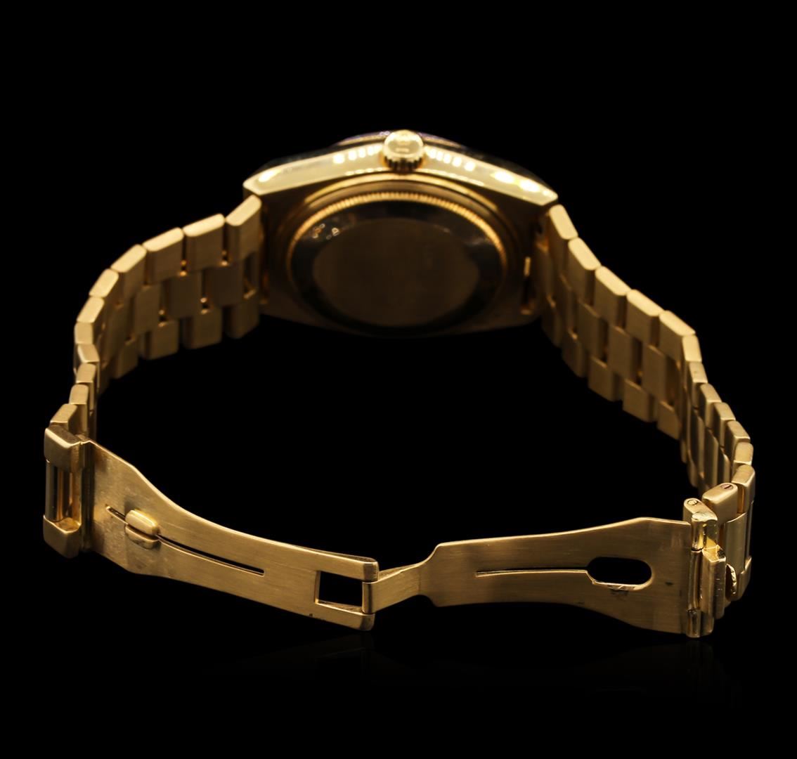 One gents, hand crafted & machine milled Rolex Day-Date OysterQuartz wristwatch electronically tested 18KT yellow gold Case: 36mm oyster quartz, Crown: twinlock with logo, Bezel: fluted, Crystal: synthetic sapphire cyclops lens. Circa 1979.Movement: Swiss quartz superlative chronometer, Custom Dial: Blue, with baton hands and indices, Calendar: single quick set, Bracelet: 18KT yellow gold, OysterQuartz, Condition: G-5 Fine. Seven and one half inch length. One removable link. Concealed deployment clasp, with logo. Total Weight of Watch 146.33gm. AIG Appraised at $20,880.00.
