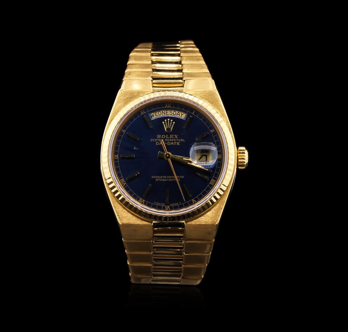 One gents, hand crafted & machine milled Rolex Day-Date OysterQuartz wristwatch electronically tested 18KT yellow gold Case: 36mm oyster quartz, Crown: twinlock with logo, Bezel: fluted, Crystal: synthetic sapphire cyclops lens. Circa 1979.Movement: Swiss quartz superlative chronometer, Custom Dial: Blue, with baton hands and indices, Calendar: single quick set, Bracelet: 18KT yellow gold, OysterQuartz, Condition: G-5 Fine. Seven and one half inch length. One removable link. Concealed deployment clasp, with logo. Total Weight of Watch 146.33gm. AIG Appraised at $20,880.00.