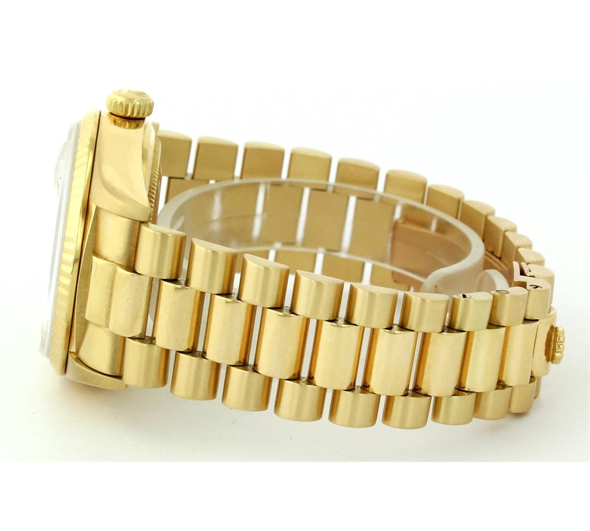One Mens Rolex Day Date President Polished, Serviced & Electronically Tested, Yellow Gold Case:36mm, Yellow Gold Crown, Bezel: 18K Yellow Gold Fluted Bezel, Custom Crystal: Acrylic Cyclops Lens. Movement: Automatic Winding Movement Caliber 3055. Dial: Champagne With Index Hour Markers and Square Roman Track, Date Window: 3 O'Clock Position, Day Display: 12 O'Clock Position, Model: 18038, Single Quickset, Condition: G-6 Extra Fine. Bracelet: Yellow Gold President Hidden Clasp With Crown Logo. Bright Polish. 6.5 Inch Length